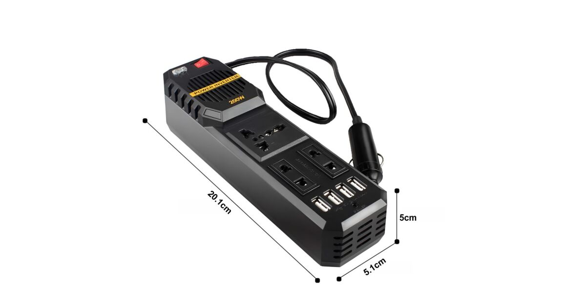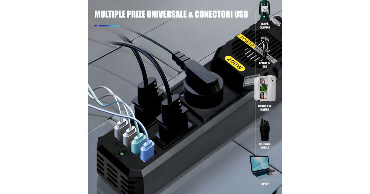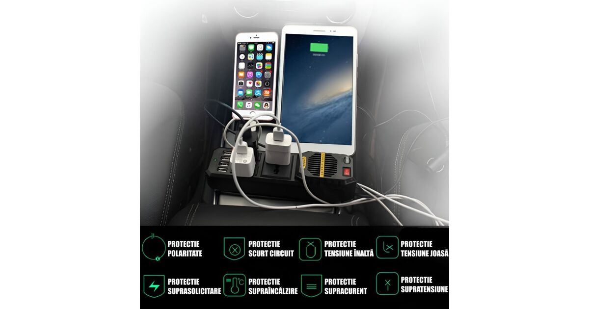 - Transformă tensiunea de 12V de la bricheta mașinii în 220V, permițându-vă să alimentați laptopuri, telefoane și alte dispozitive.