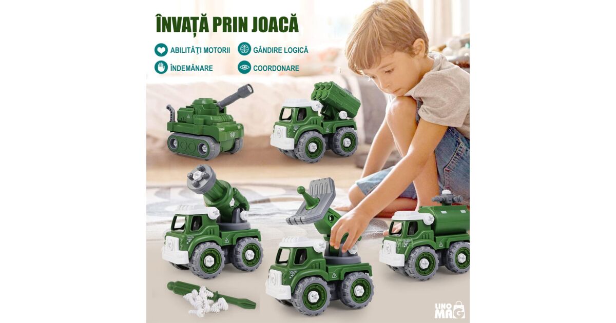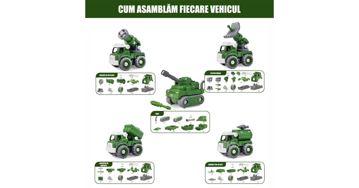 Robot Transformer DIY in 5 Masini Militare, Linomag®, Vehicul artilerie, Tun cu apa, Lansator de rachete, Sistem radar, Tanc, Surubelnita Inclusa, + 3 Ani, Verde, 31.5x15.7x21.6cm Descriere