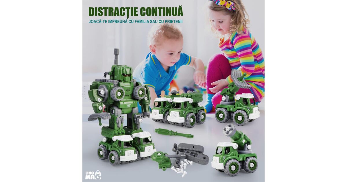 - Jucărie distractivă: Două moduri de asamblare: 5 vehicule separate sau un robot mare.