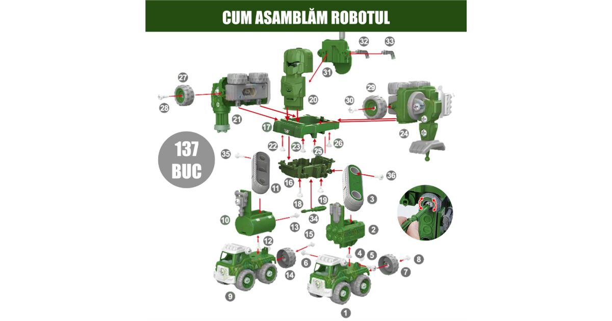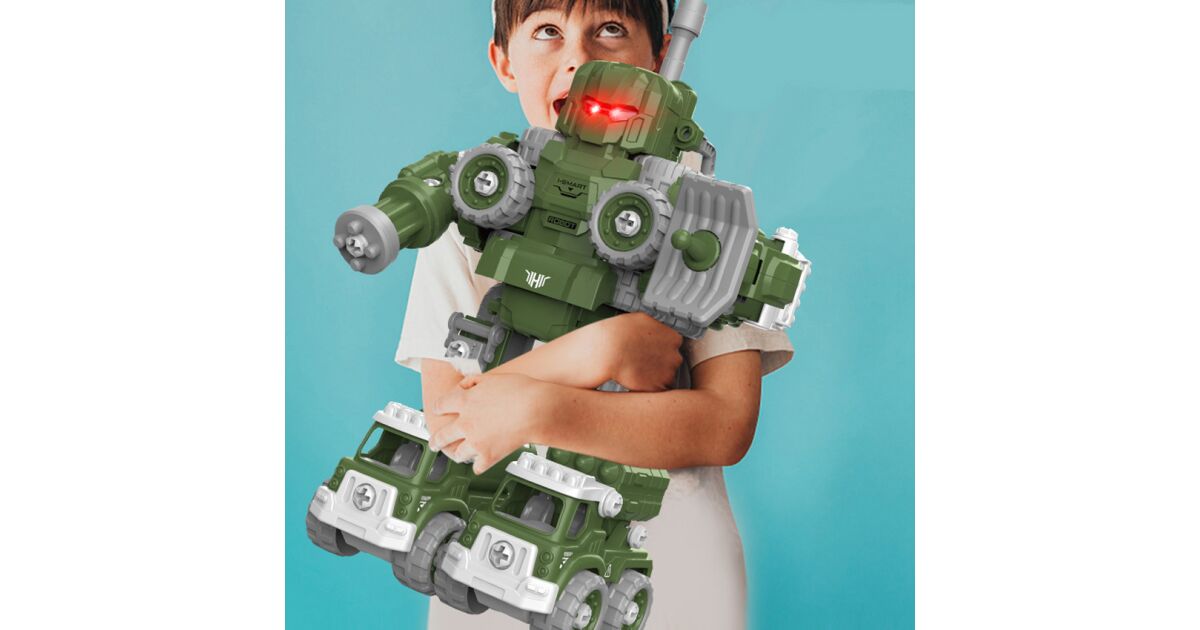 Acest set impresionant de robot transformator militar 5 în 1 oferă ore întregi de distracție și dezvoltare pentru copiii de peste 3 ani! Setul de 137 de piese poate fi asamblat în 5 vehicule militare diferite (vehicul de artilerie, tanc, sistem radar, tun cu apă, lansator de rachete), care apoi pot fi transformate într-un robot uriaș!