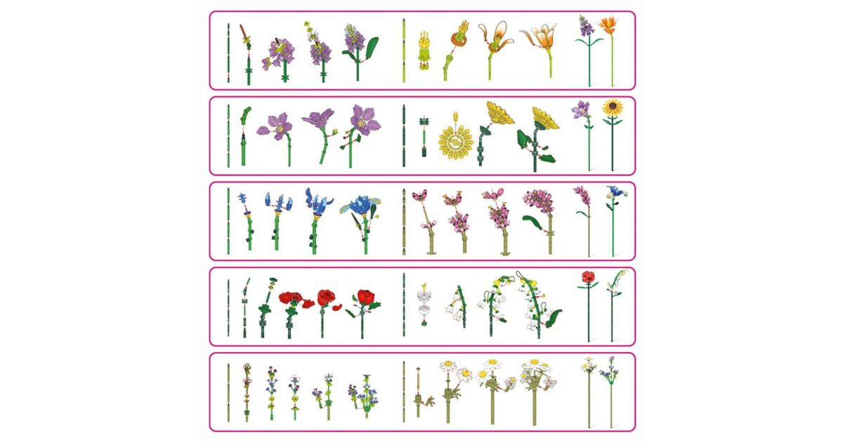 Aceste flori vor fi decorațiuni fantastice pentru biroul tău, raftul tău sau orice altă cameră. Datorită elementelor de construcție variate, fiecare floare va fi unică și specială. Numărul de elemente de construcție per floare variază, astfel încât fiecare construcție reprezintă o nouă provocare.