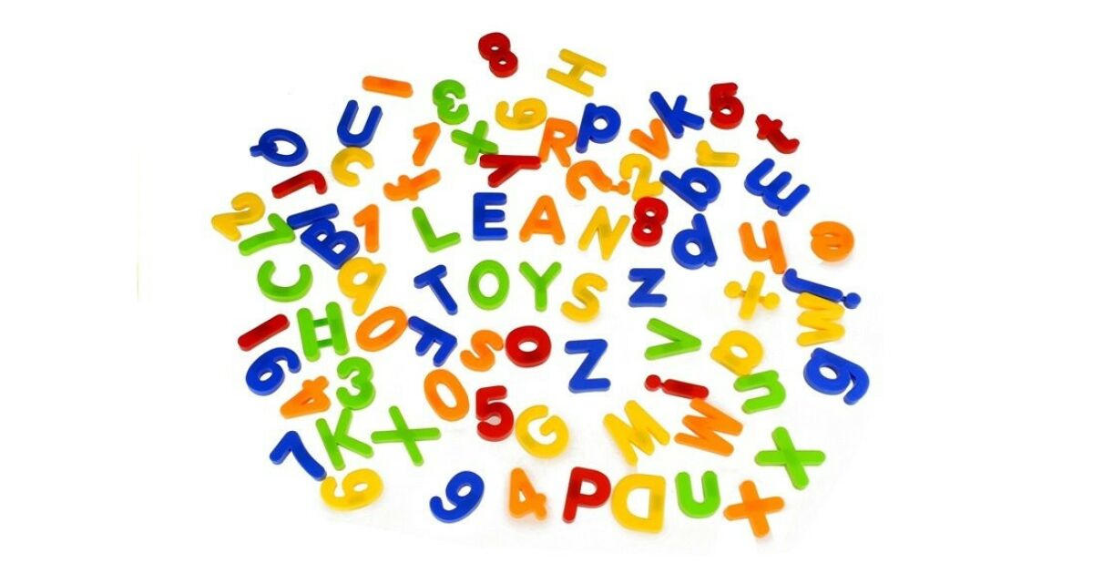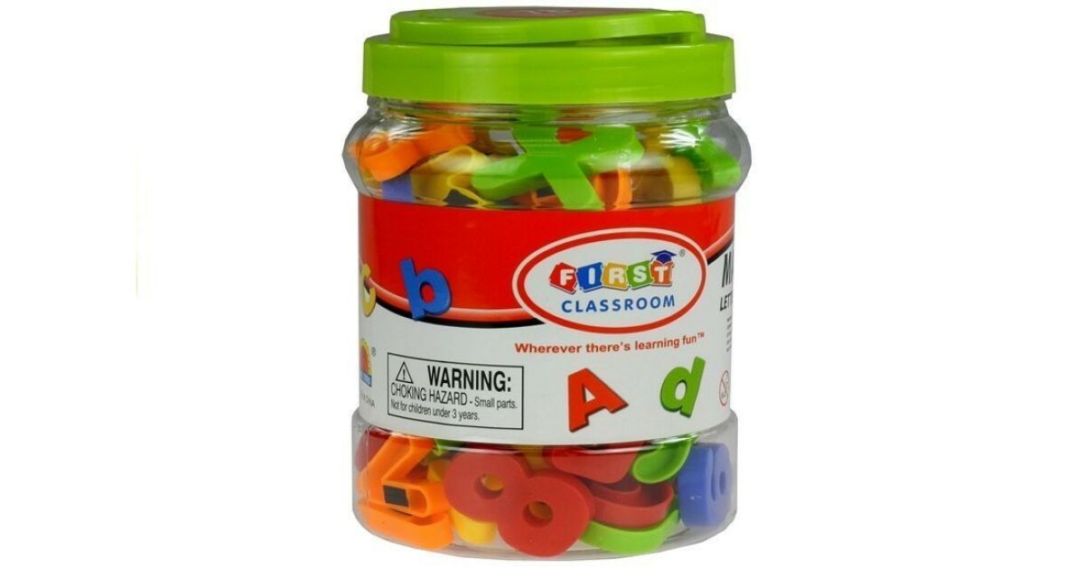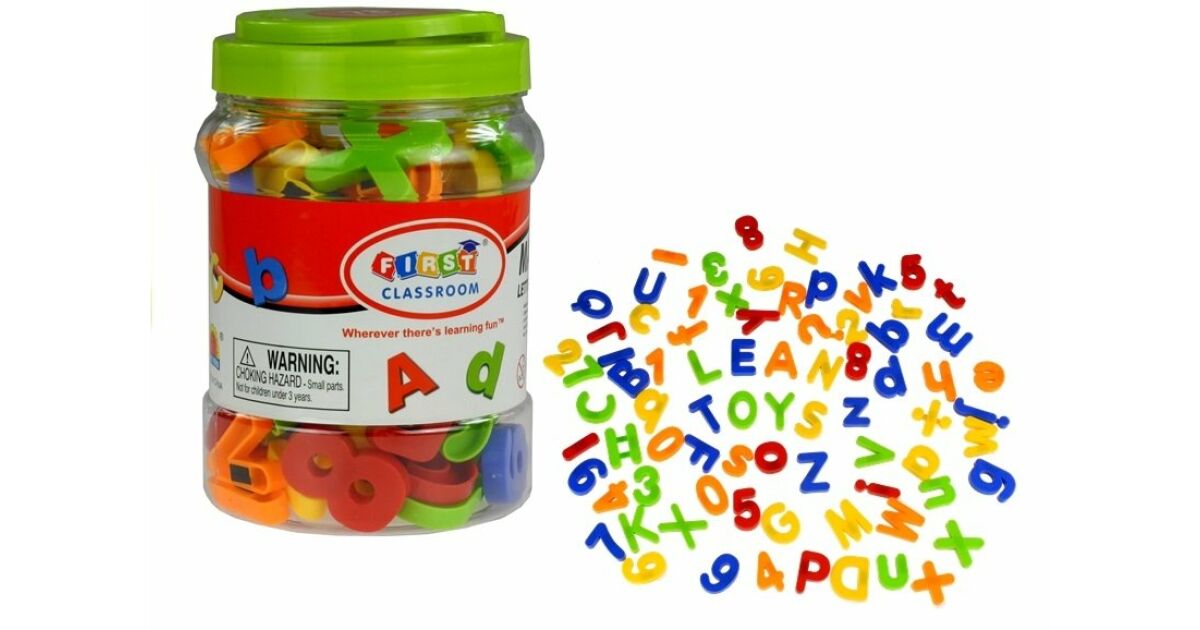 Litere și numere magnetice într-un borcan, alfabet cu 78 de elemente