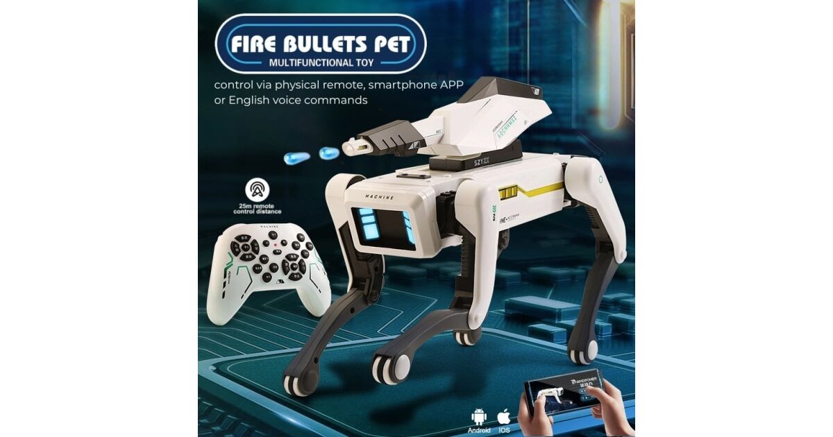 - Acțiuni diverse: Câinele robot poate face flotări, poate scărpina cu laba, poate executa atacuri Kung-Fu, poate dansa, cânta și chiar spune povești! 🎶