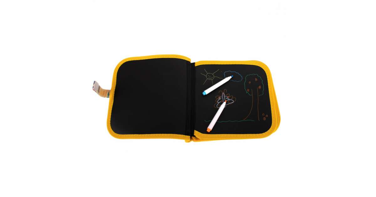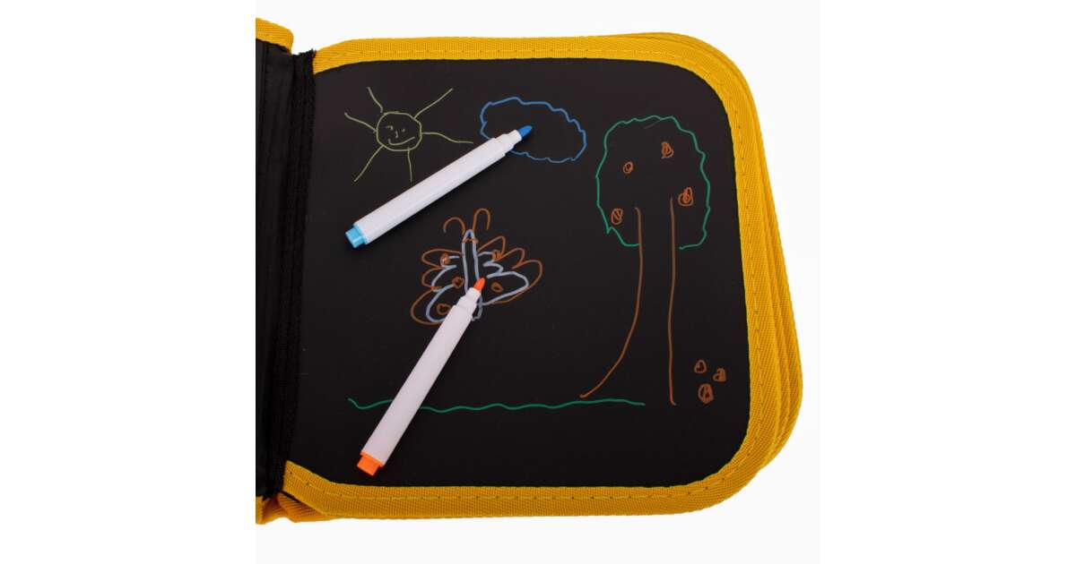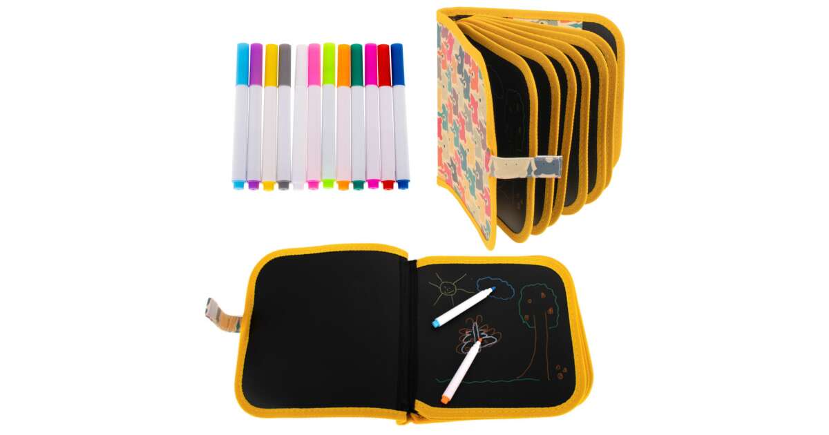 Acesta este un caiet cu cretă portabil, perfect pentru distracție creativă oriunde, oricând! Cu cele 14 pagini negre și cele 12 crete colorate, garantat că va ține copiii ocupați ore întregi. Fabricat din material impermeabil, caietul se curăță ușor, așa că creația artistică nu va fi o problemă.