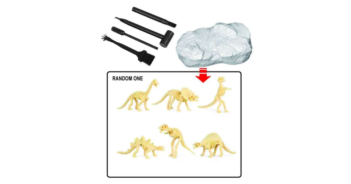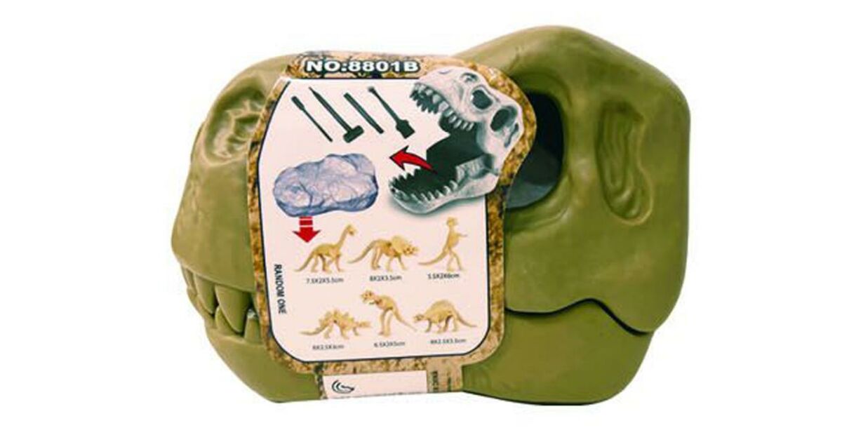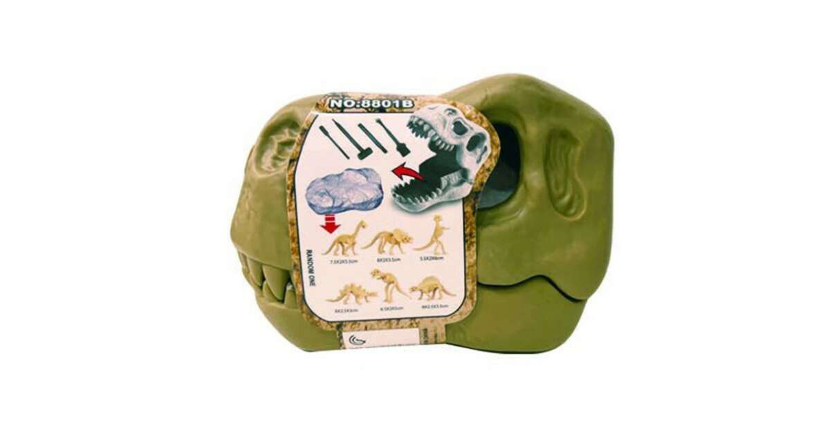 - Un craniu de dinozaur din material rezistent, în care se ascunde un schelet de dinozaur.