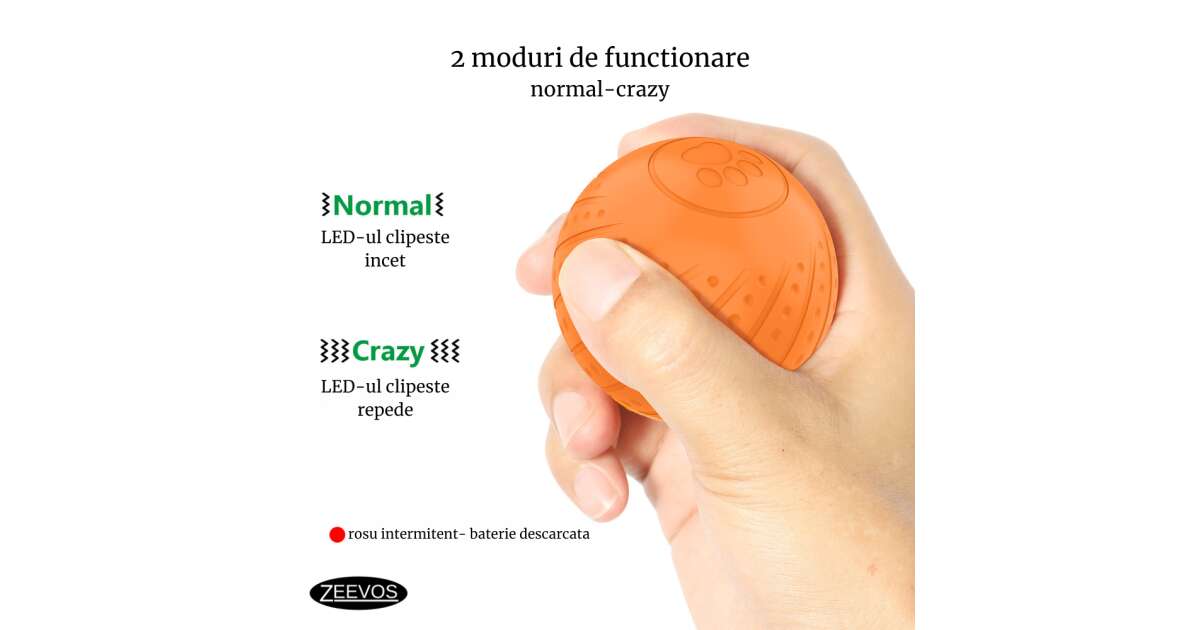 - Distracție infinită: Mingea are două moduri: modul "normal" și modul "nebun". În modul normal, se rostogolește încet, în timp ce în modul nebun se mișcă rapid și sare. Luminițele LED adaugă un plus de emoție jocului.