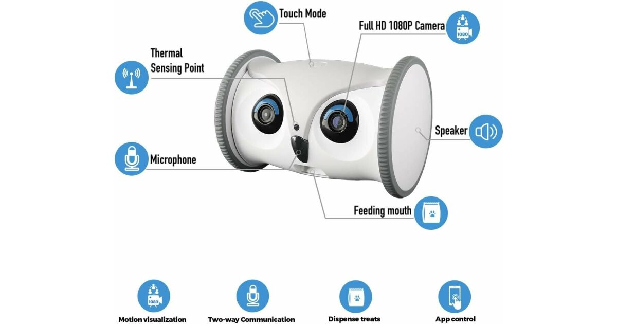 Telecomandă și interacțiune inteligentă: Controlează robotul bufniță de la distanță prin intermediul aplicației, mișcă-l prin casă și urmărește-ți animalul de companie, angajându-te într-un joc distractiv de-a v-ați ascunselea. Robotul activează automat diferite moduri folosind un senzor infraroșu pentru a-ți implica animalul de companie și a-l menține activ. Cameră Full HD și vedere nocturnă: Echipat cu o cameră Full HD de 1080p cu zoom 4x și vedere nocturnă, permițându-ți să-ți vezi clar animalul de companie zi și noapte, să faci fotografii și videoclipuri de înaltă calitate și să ai control flexibil asupra robotului bufniță. Distribuire de recompense și comunicare audio bidirecțională: Robotul se poate mișca și lăsa o urmă de recompense pentru a atrage animalul tău de companie curios. Dacă animalul tău de companie este anxios sau se comportă urât, îl poți calma cu vocea ta și îi poți distribui recompensele preferate (dimensiuni de la 4 la 16 mm) spre bucuria lui. Detectarea mișcării și înregistrarea pe un card de memorie: Robotul răspunde automat la atingeri și înregistrează comportamentul animalului tău de companie. După introducerea unui card de memorie TF (nu este inclus), poți configura înregistrarea video automată pentru a monitoriza situația din casa ta 24/7. Caracteristici suplimentare: Până la 8 ore de funcționare zilnică. Două moduri de conectare fac utilizarea convenabilă: chiar dacă telefonul nu are acces la rețea, puteți utiliza Owl în modul AP (necesită Wi-Fi 2.4G acasă pentru telecomandă, nu este compatibil cu Wi-Fi 5G).
