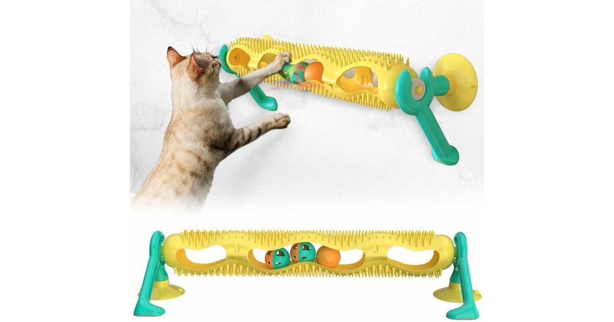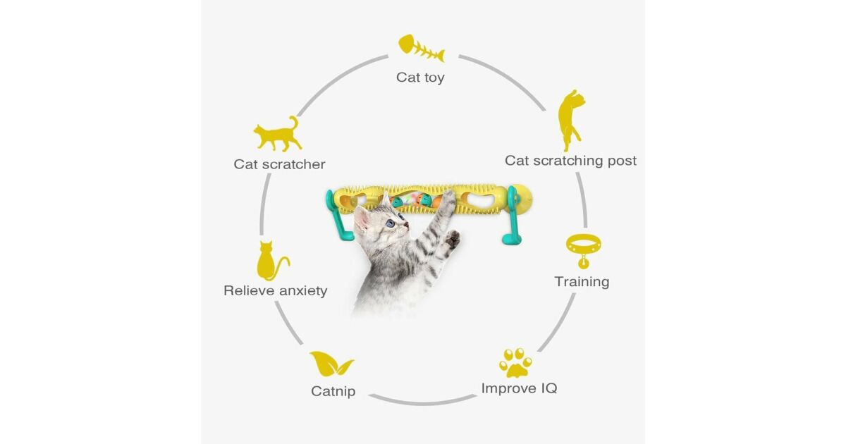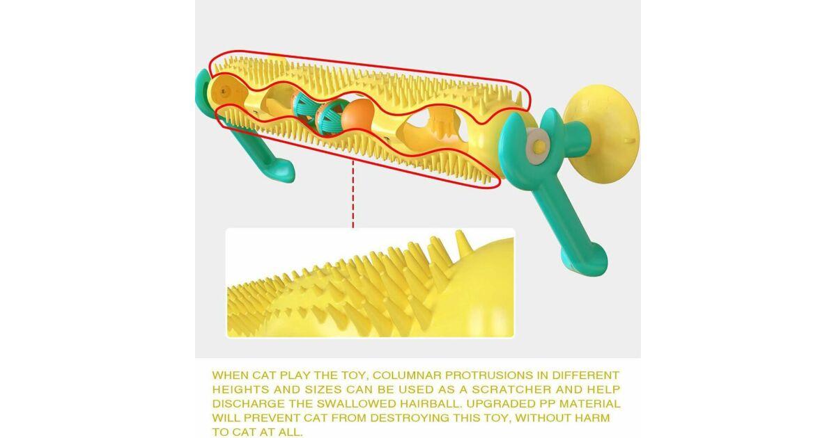 Această jucărie interactivă pentru pisici are o bilă strălucitoare încorporată și bile umplute cu catnip pentru a distra pisica și a reduce anxietatea. Protuberanțele de diferite înălțimi și dimensiuni permit pisicilor să se îngrijească în timp ce se joacă, ajutând la prevenirea formării ghemotoacelor de păr. Materialul durabil din polipropilenă protejează jucăria de mestecat și este sigură pentru pisica ta. Baza puternică cu ventuză poate fi folosită ca și cadru de cățărat, iar designul unic permite atașarea acesteia la orice suprafață. Jucăria este fabricată din materiale sigure și include bare de protecție cu masaj pentru o plăcere suplimentară. Vine cu două bile cu catnip și o bilă care poate fi combinată cu alte jucării pentru pisici.