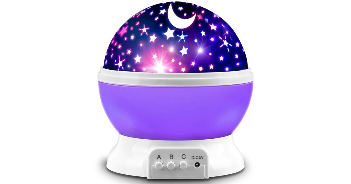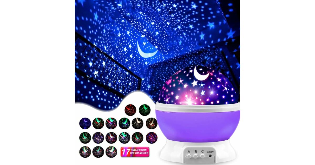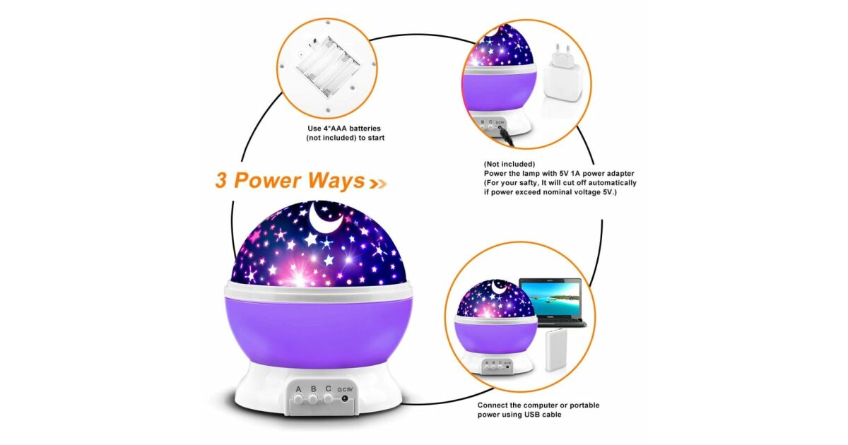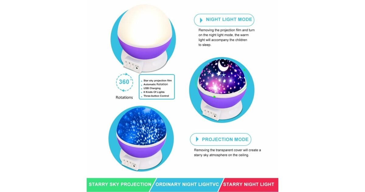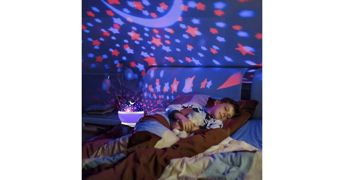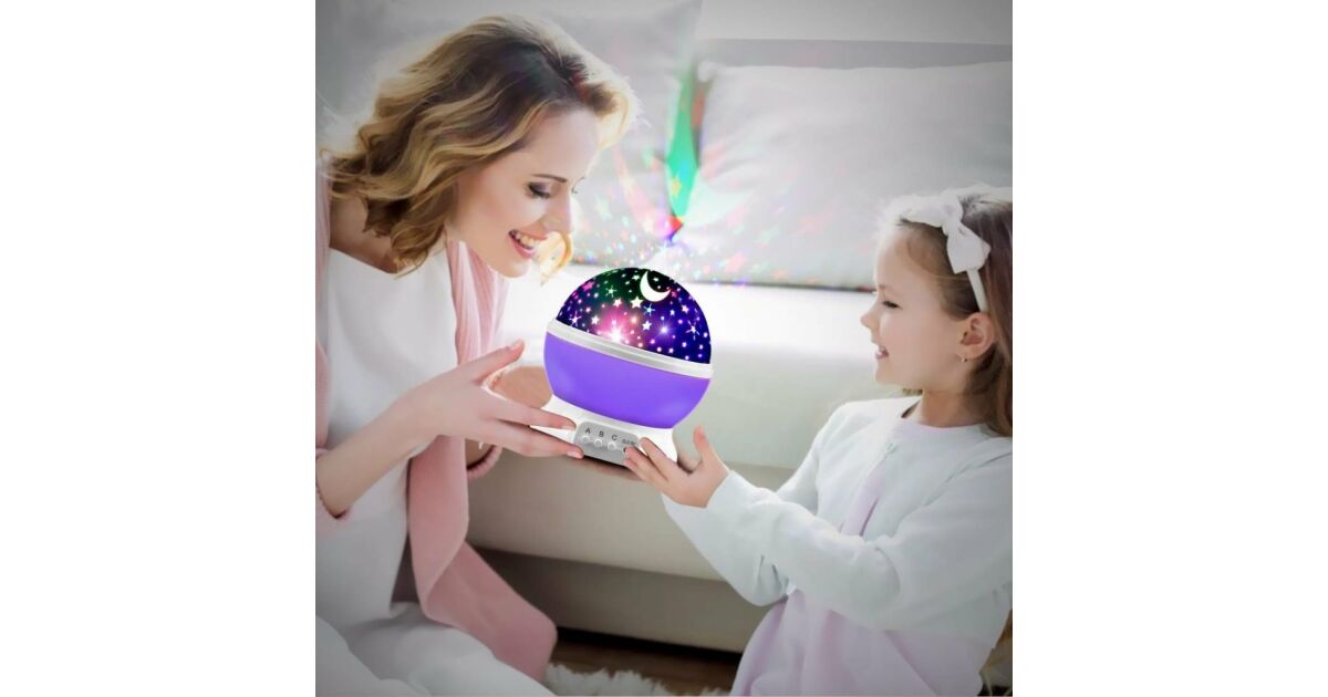 Proiector Lumini de Noapte pentru Copii, Lampa de veghe Rotativa, cu Proiectie Stele si Luna, Ideala pentru un Somn Linistit Mov Descriere