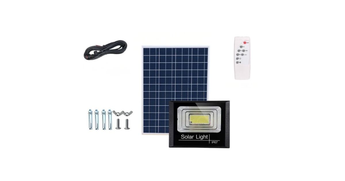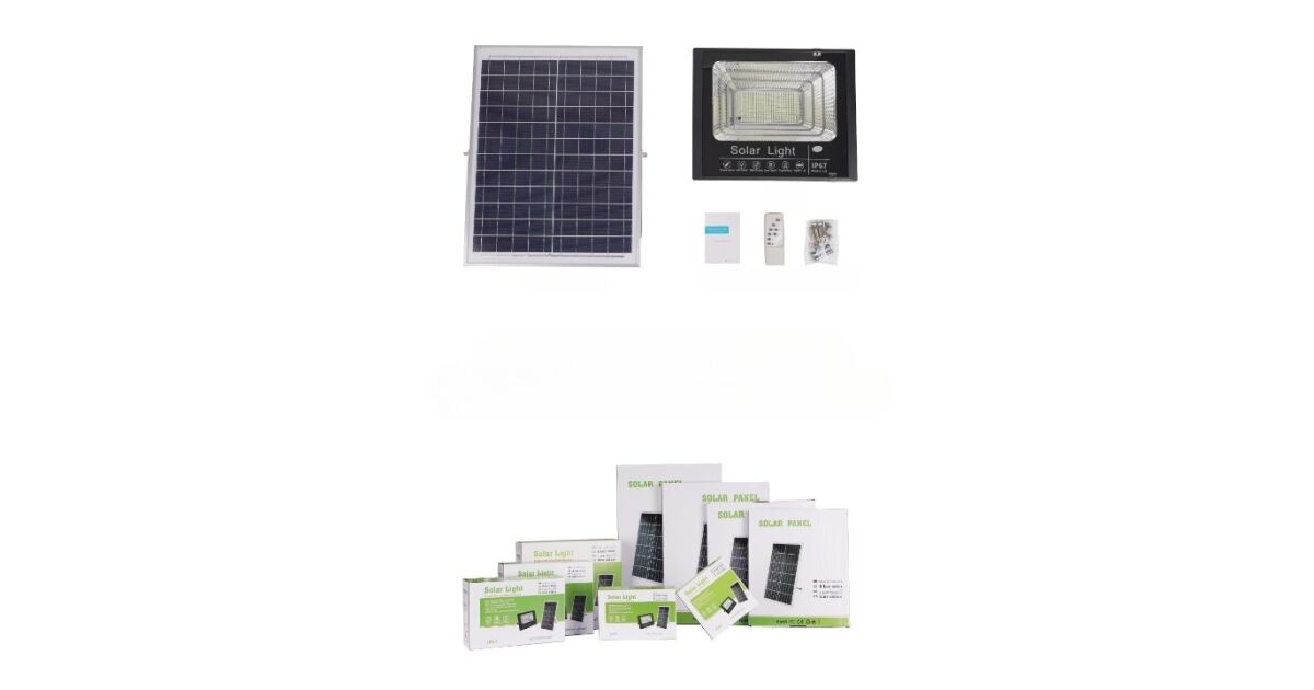 Conținutul pachetului: 1 x panou solar, 1 x proiector, 1 x telecomandă, șuruburi de fixare, ramă de fixare, baterii.