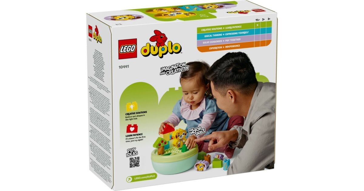 Puneți două jucării diferite în mâinile preșcolarilor iubitori de câini cu Shape Picker. Recomandat pentru vârsta de la 18 luni în sus, acest joc dezvoltă abilitățile motorii fine și oferă preșcolarilor o modalitate distractivă de a învăța despre forme și rezolvarea problemelor în timp ce construiesc o casă pentru căței și apoi potrivesc formele în fantele de pe acoperiș. Acest joc pentru copii mici, care se concentrează pe conștientizarea spațială, are o mulțime de activități de familie distractive. Adulții pot indica diferitele forme din set în timp ce cei mici construiesc copacii, figurinele câinilor sau chiar casa. Ei pot chiar să joace povești cu simpaticii câini de jucărie LEGO® DUPLO®, să joace mingea cu ei sau să le dea oase. Când jocul imaginativ se termină, este timpul pentru distracția sortării formelor! Micuții tăi vor învăța răbdare și concentrare în timp ce caută forme care se potrivesc în locașurile lor. Dacă la început nu găsesc forma potrivită, își vor dezvolta perseverența și coordonarea mână-ochi pe măsură ce încearcă să găsească din nou forma potrivită.