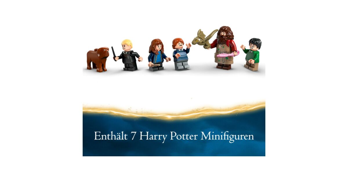 - 5 minifigurine LEGO: Harry Potter, Hermione Granger™, Ron Weasley™, Draco Malfoy™ și Rubeus Hagrid™