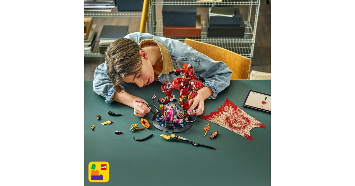 LEGO® NINJAGO® Robotul de luptă Cavalerul de Foc: Construiește și expune această scenă de luptă uimitoare! 🔥