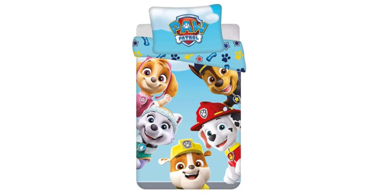 Patrula Cățelușilor, echipa Paw Patrol lenjerie de pat pentru copii. Mărime: Husă de pernă: 40x60 cm Husă de pătură: 100x135 cm Material: 100% bumbac.