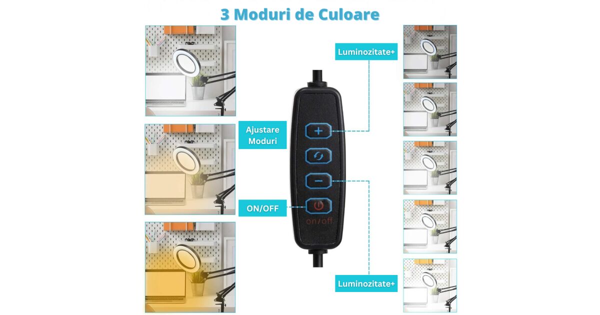 - 3 moduri de iluminare: Lumină caldă, rece și neutră pentru o vedere mai confortabilă.