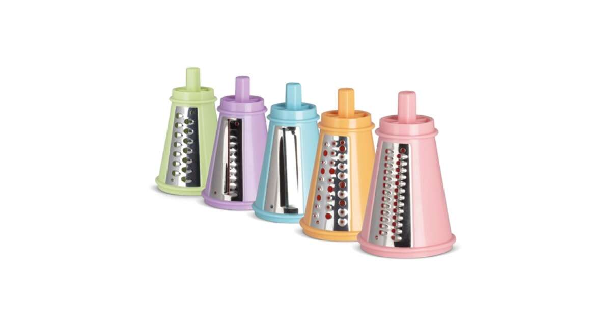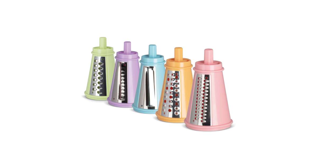 - 5 capete de feliat interschimbabile: pentru feliere subțire, ondulată, răzătoare grosieră și fină, plus o răzătoare foarte fină pentru nuci etc.