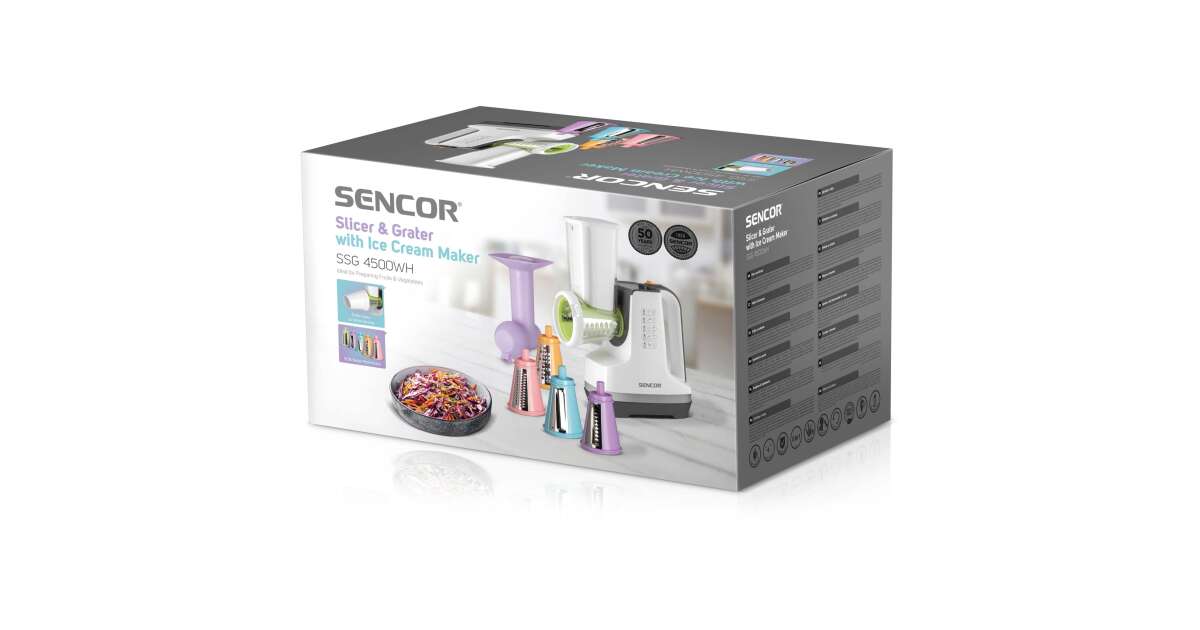 Acest aparat Sencor SSG 4500WH versatil e mult mai mult decât un simplu feliator! Feliază, toacă, rade și chiar prepară înghețată! Cu cele 5 accesorii interschimbabile, satisface orice nevoie, fie că e vorba de felii subțiri de cartofi, salată de fructe sau înghețată de casă.