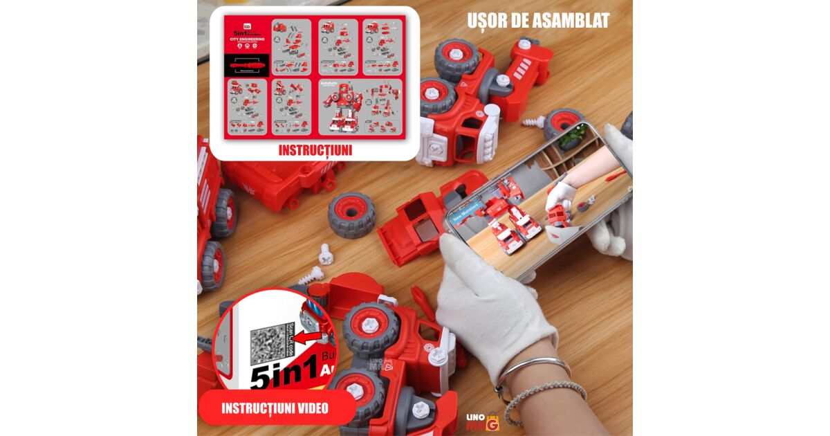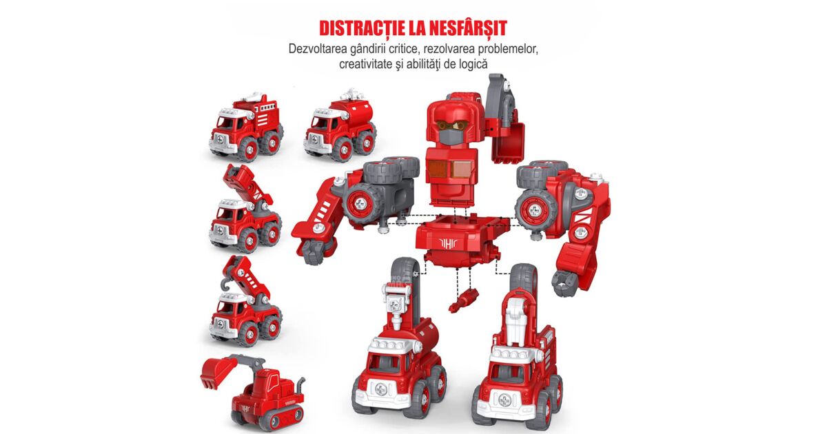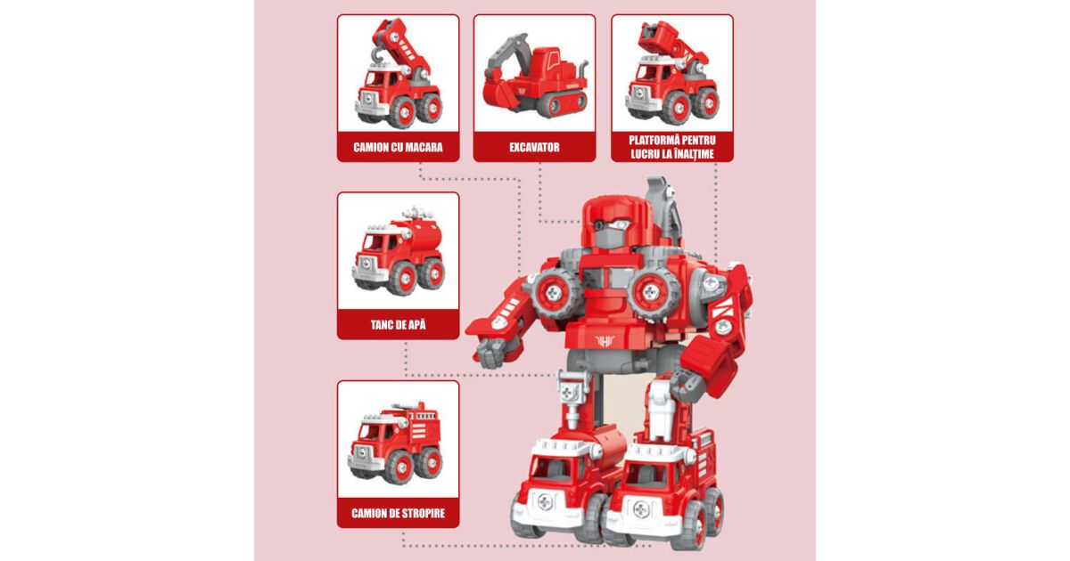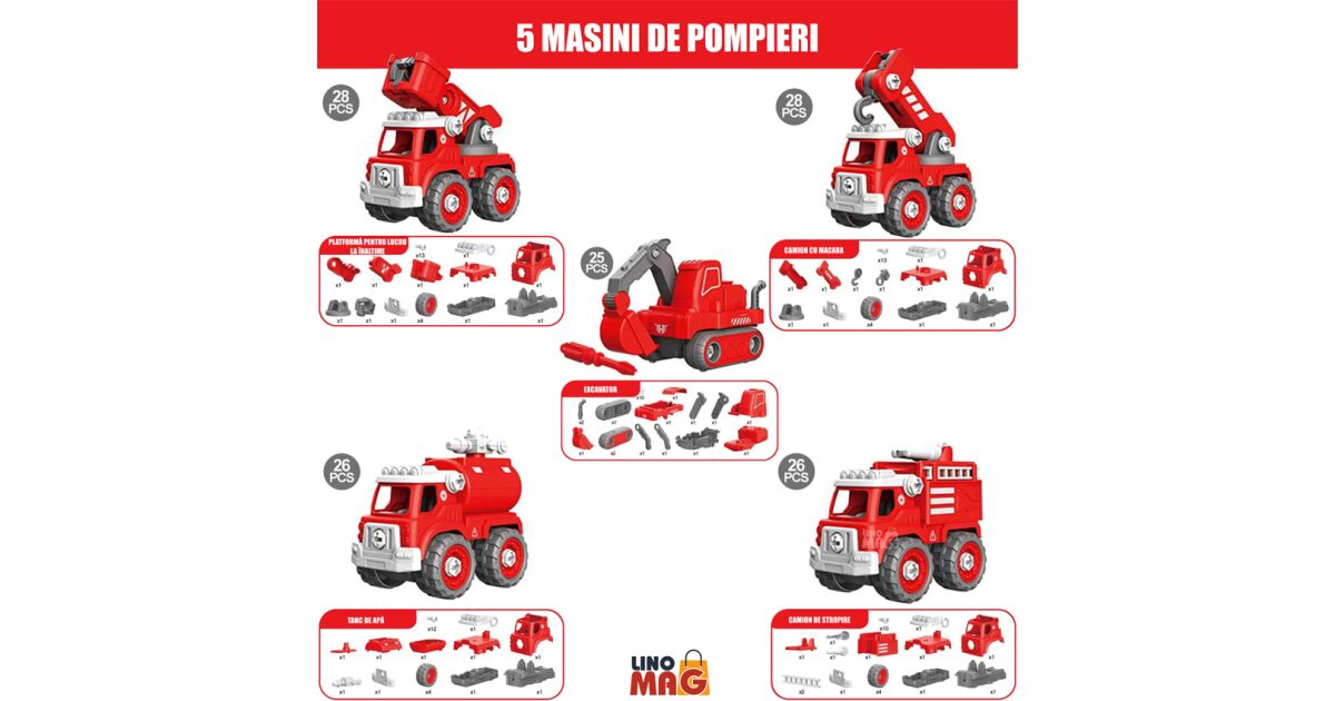 Robot Transformer DIY in 5 Masini de Pompieri, Linomag®, Camion cu macara, Excavator, Platforma lucru la inaltime, Tanc de apa, Camion de stropire, Surubelnita Inclusa, + 3 Ani, Rosu, 31.5x15 Descriere