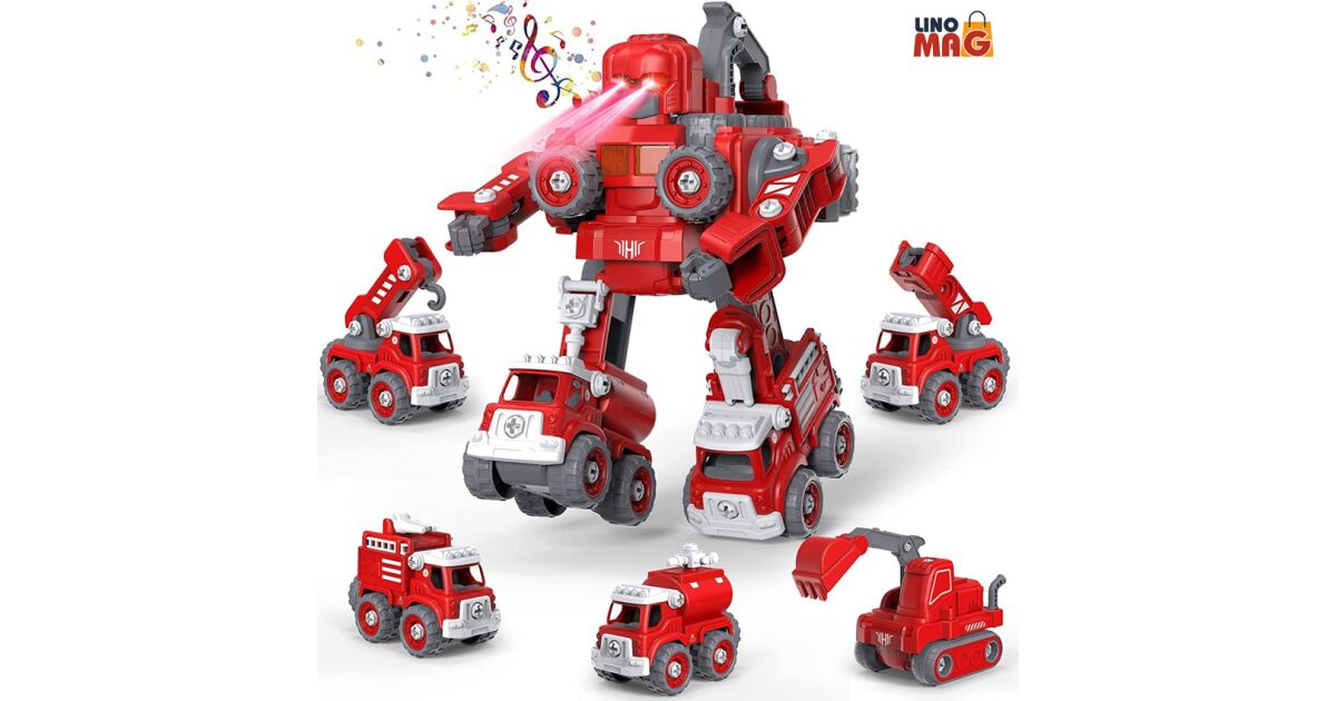 Robot Transformer DIY in 5 Masini de Pompieri, Linomag®, Camion cu macara, Excavator, Platforma lucru la inaltime, Tanc de apa, Camion de stropire, Surubelnita Inclusa, + 3 Ani, Rosu, 31.5x15