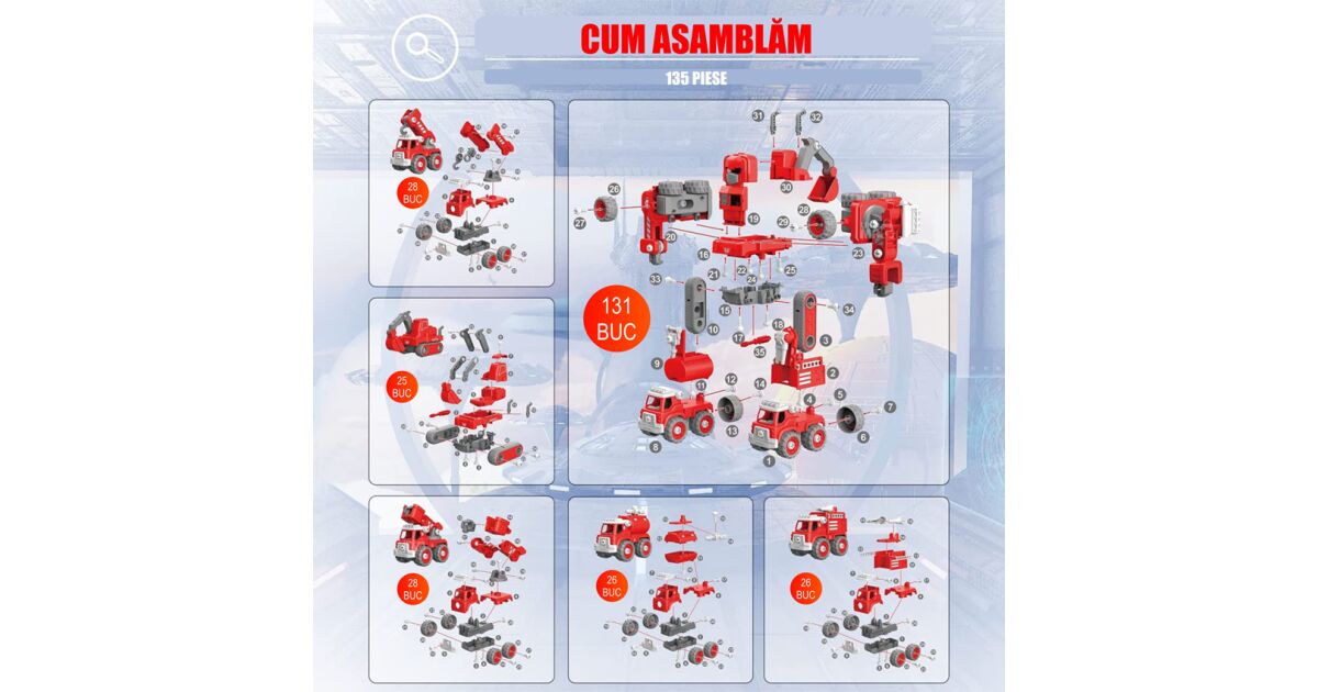 Acest set uimitor de 135 de piese poate fi asamblat în 5 mașini de pompieri separate (macara, excavator, platformă de lucru la înălțime, cisternă de apă, mașină de stropit) sau transformat într-un robot de 31,5 cm înălțime! Datorită șurubelniței manuale, cei mici pot dezasambla și reasambla cu ușurință vehiculele și robotul.