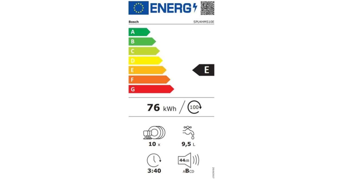 - Economie de energie: Clasa energetică E, consum de 76 kWh/9,5 litri de apă pe ciclu.