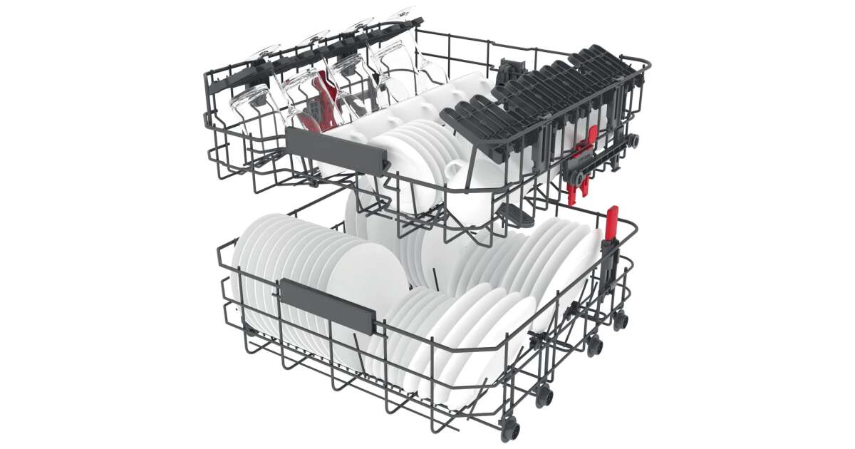 - 4 rânduri de suporturi pliabile pentru farfurii în coșul inferior: utilizare optimă a spațiului.