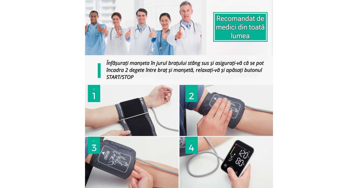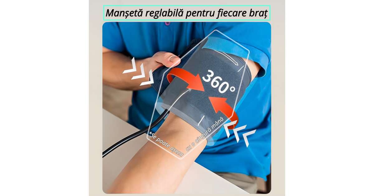 - Manșetă reglabilă la 360 de grade: Se potrivește perfect pe braț, asigurând o măsurare precisă.