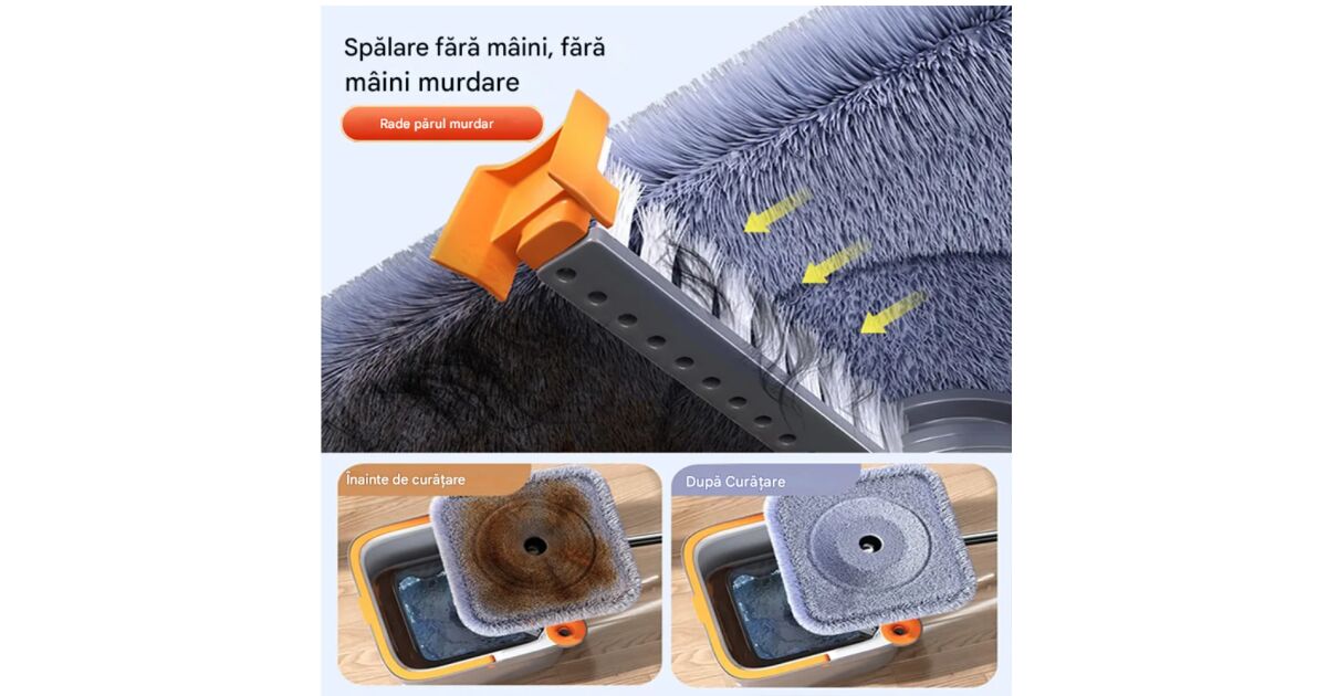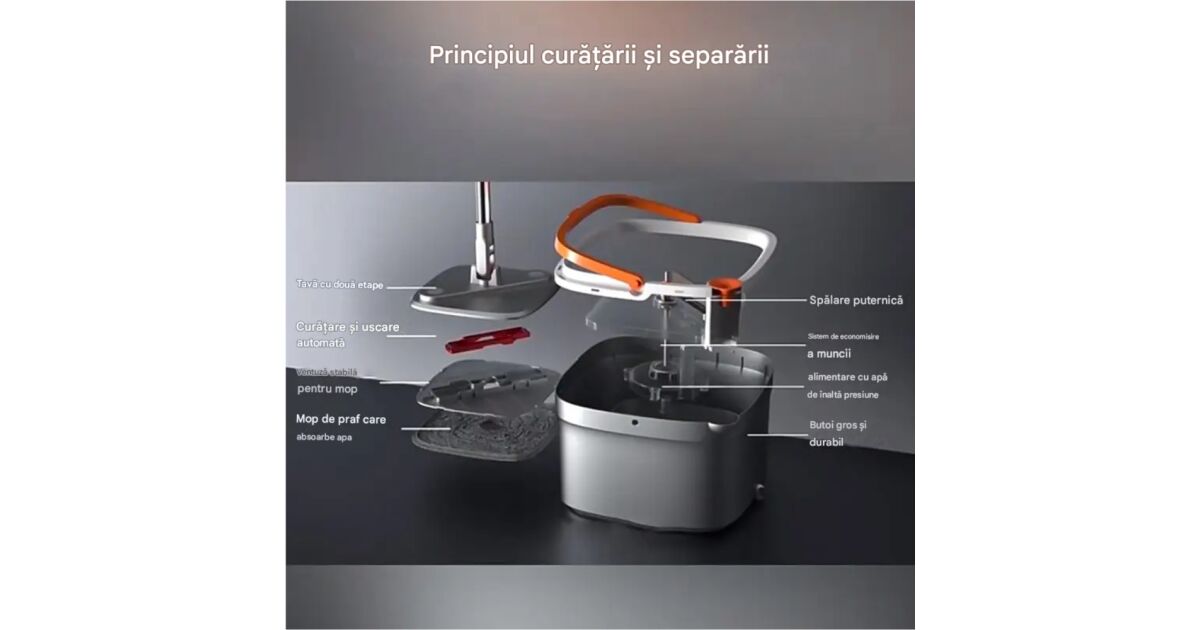 - 🔄 Cap rotativ de mop: Curăță temeinic suprafețele, ajungând în fiecare colț fără efort suplimentar.