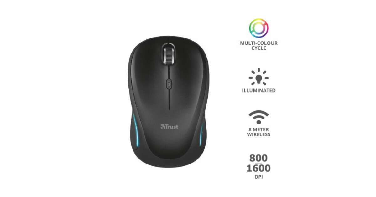 Acest mouse wireless Trust Yvi FX este perfect pentru utilizarea zilnică. Designul său elegant, negru și forma ergonomică îți oferă o experiență plăcută. Iluminarea integrată adaugă un plus de stil. Utilizatorii au subliniat și aspectul estetic al mouse-ului.