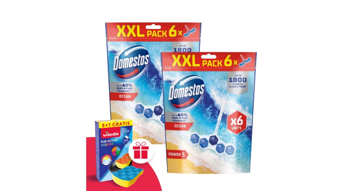 Domestos Power5 Bloc de împrospătare a toaletei Ocean (12x50g) + cadou Vileda Sponge