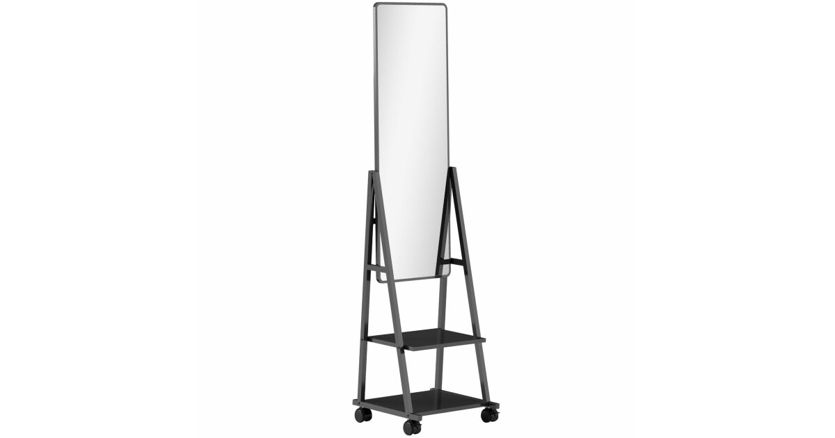 HOMCOM Oglindă Verticală cu 2 Rafturi și 4 Rotile, Oglindă de Podea din Oțel și PAL, 42x37x155 cm, Negru Descriere