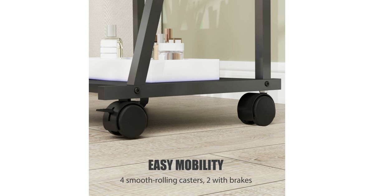 Această oglindă pe picior de la HOMCOM nu doar că îți permite să te vezi în întregime, dar oferă și o soluție practică de depozitare pentru accesoriile tale. Datorită rotilelor, o poți muta cu ușurință, astfel încât să fie mereu acolo unde ai nevoie!