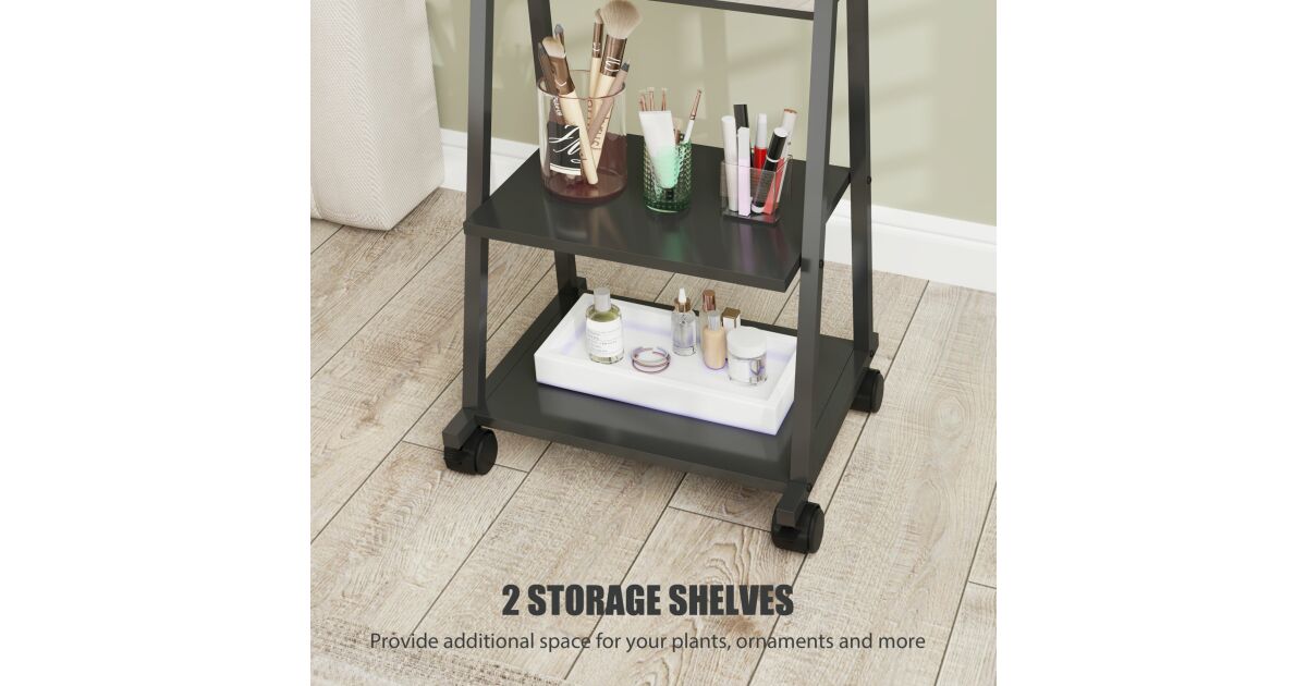Această oglindă stilată și funcțională este o completare perfectă pentru dormitorul, dressingul sau chiar camera de zi. Datorită rafturilor, îți poți organiza accesoriile preferate, iar rotilele asigură o mutare ușoară. Bucură-te de funcționalitate și stil în același timp! ✨