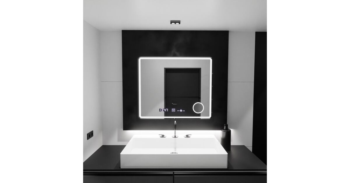 Oglinda LED Rectangulara, 90x75cm, Riflesso MotionGlow Marcello, Sistem Dezaburire, Ceas & Termometru, Lupa Cosmetica, Dimabila Descriere