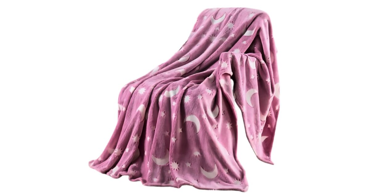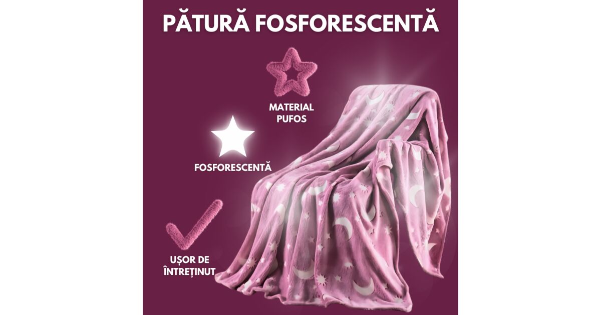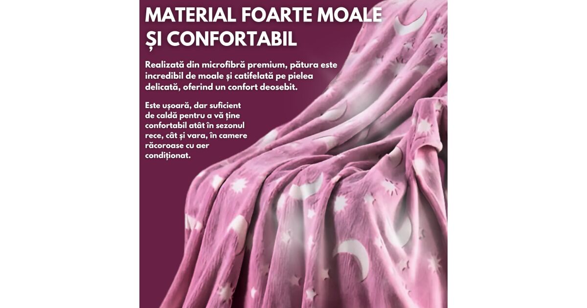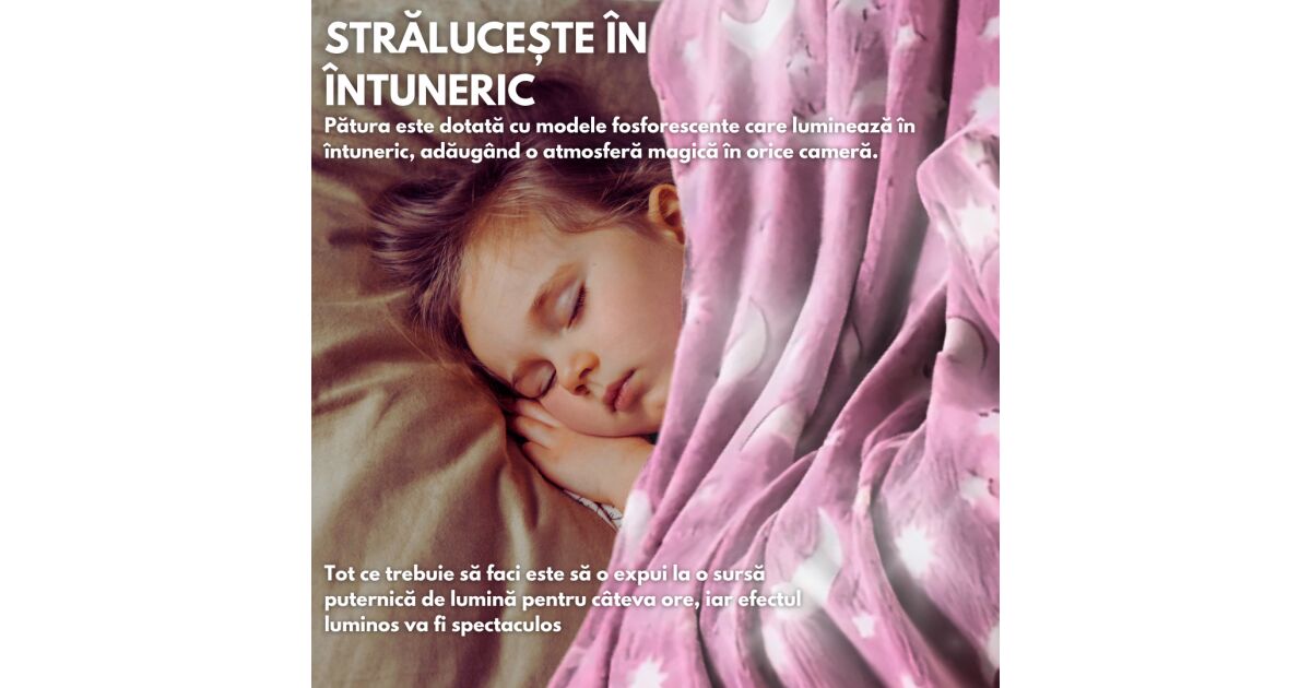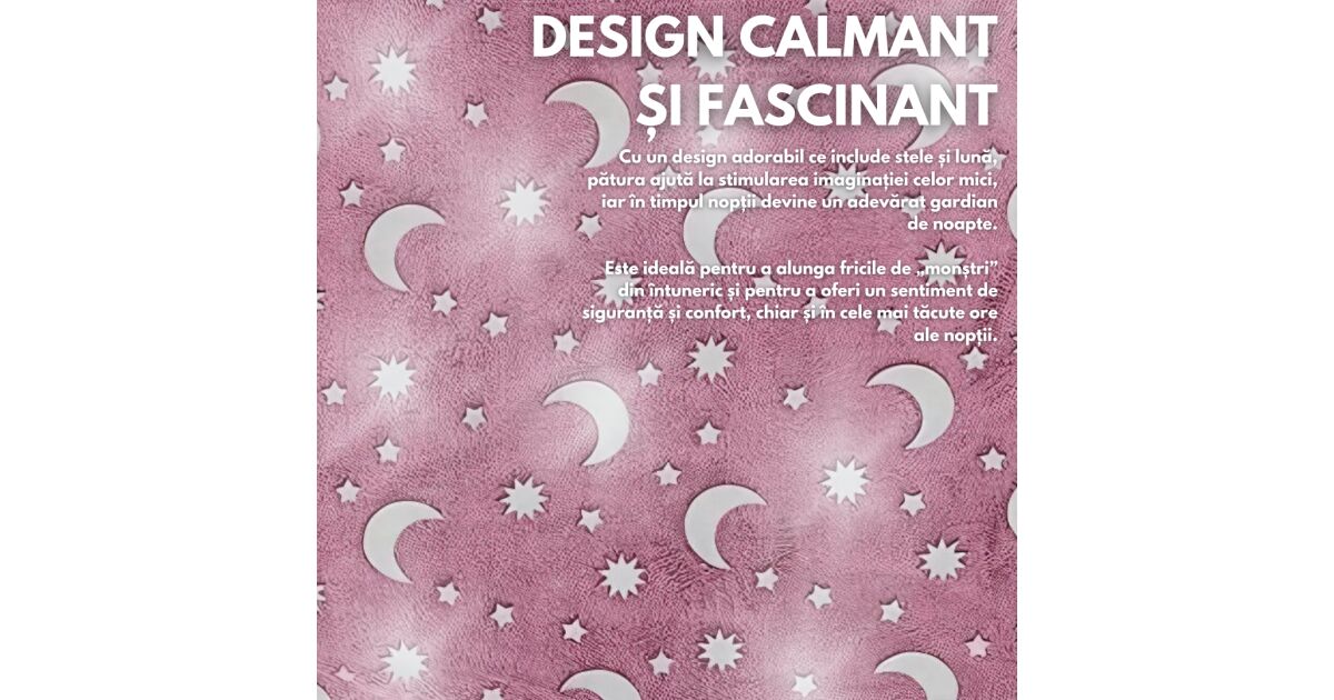 Această pătură moale din microfibră este decorată cu stele și luni care luminează delicat în întuneric, creând o atmosferă magică pentru somn. Este ideală atât pentru copii, cât și pentru adulți care iubesc atmosfera de basm și păturile confortabile.