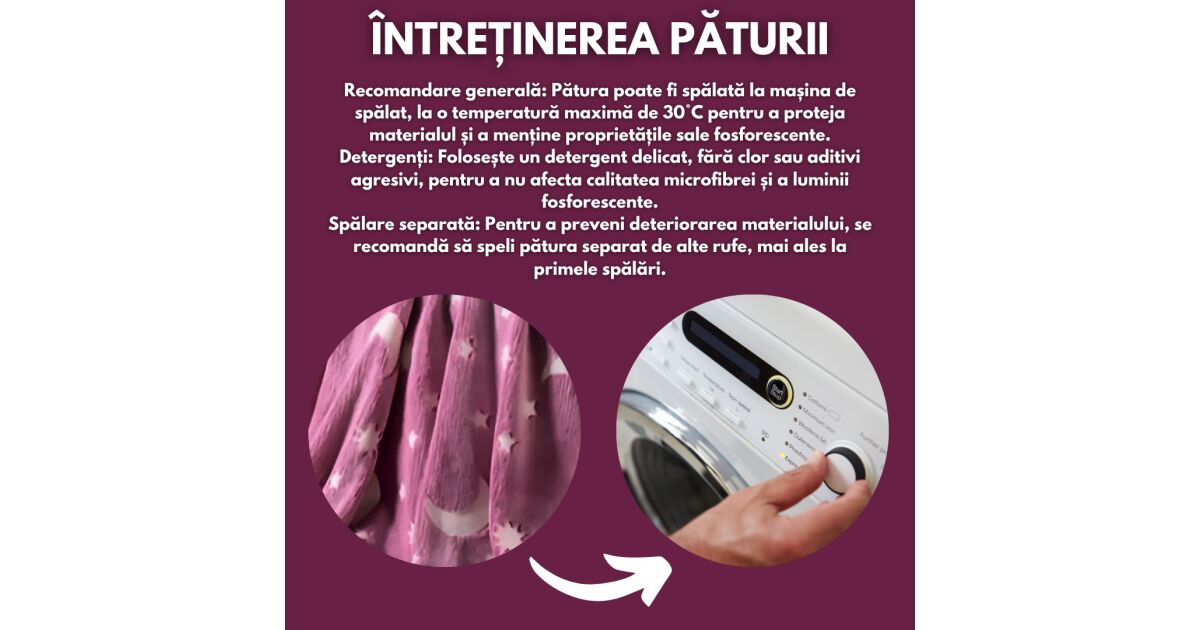 Pentru a maximiza efectul fosforescent, expuneți pătura la o sursă de lumină puternică înainte de utilizare.