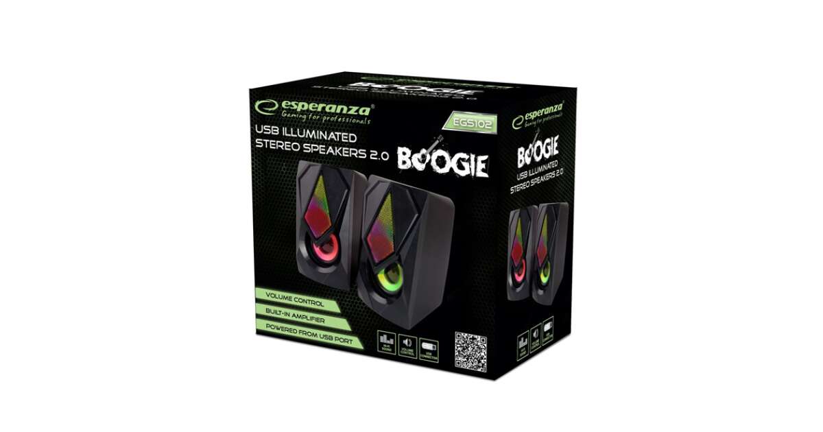 Bucură-te de muzică cu această boxă USB Esperanza Boogie 2.0 compactă, dar puternică! Iluminarea RGB LED integrată creează o atmosferă magică, în timp ce sunetul stereo de înaltă calitate te va cuceri. Alegerea perfectă pentru laptopuri și desktop-uri.
