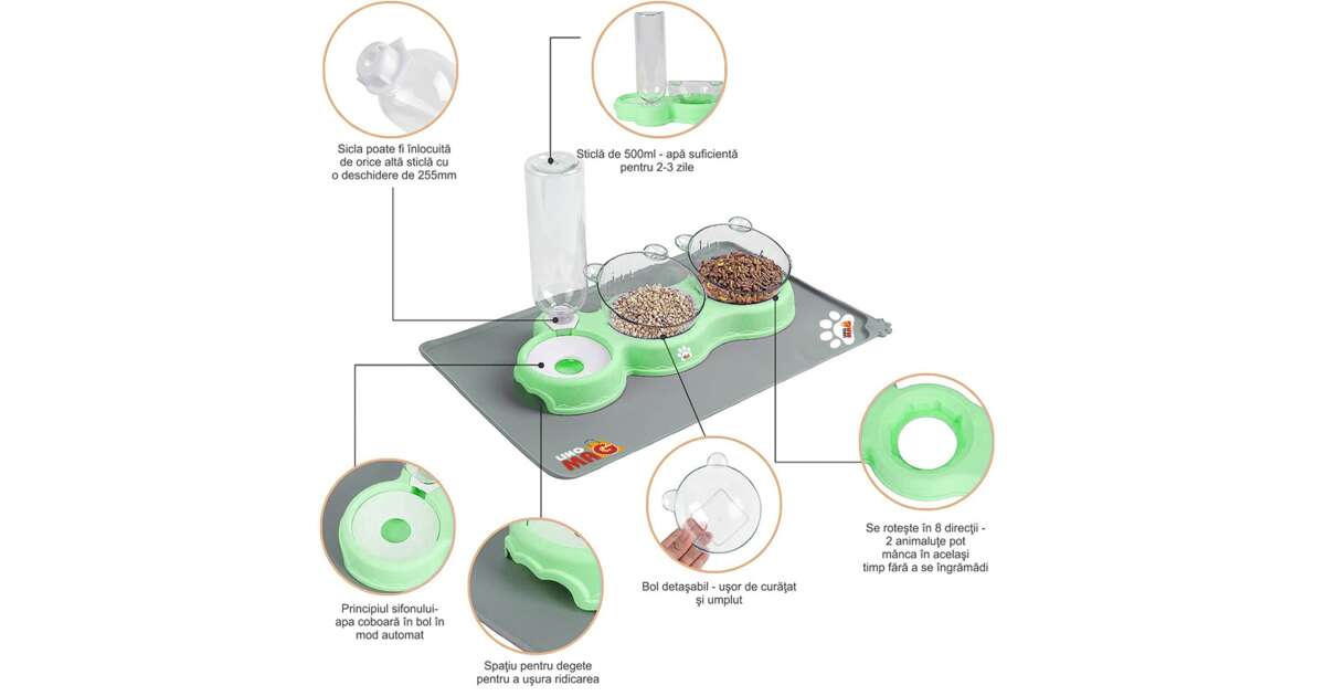 - Dozator automat de apă (500ml): Apă proaspătă mereu pentru prietenul tău blănos 💧