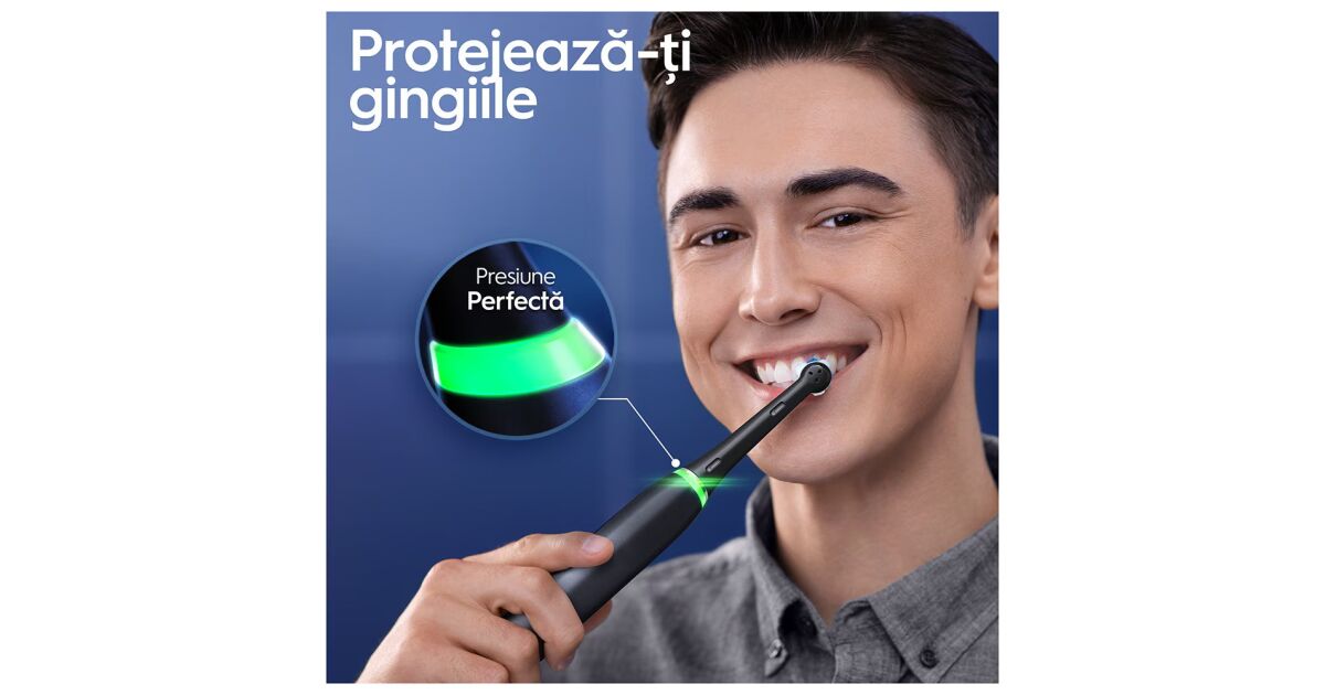 - 🔴 Senzor inteligent de presiune: Protejează gingiile de presiunea excesivă. Se aprinde în roșu dacă apeși prea tare și în verde dacă presiunea este adecvată.