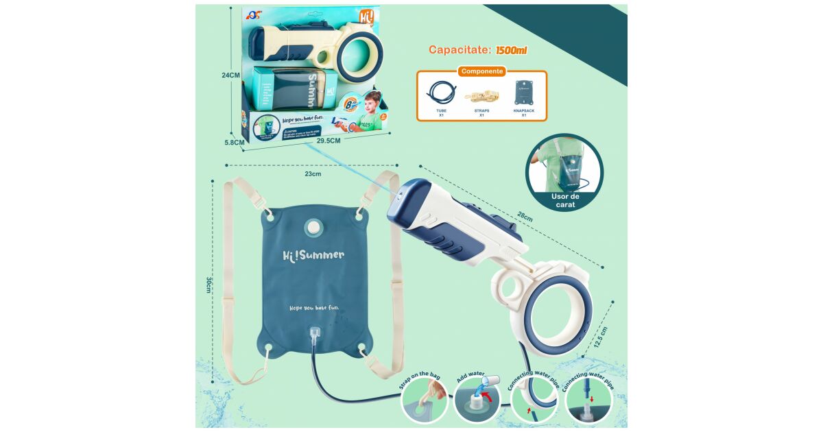 - Rezervor mare: 1500 ml pentru ore întregi de joacă fără întrerupere! 🎉