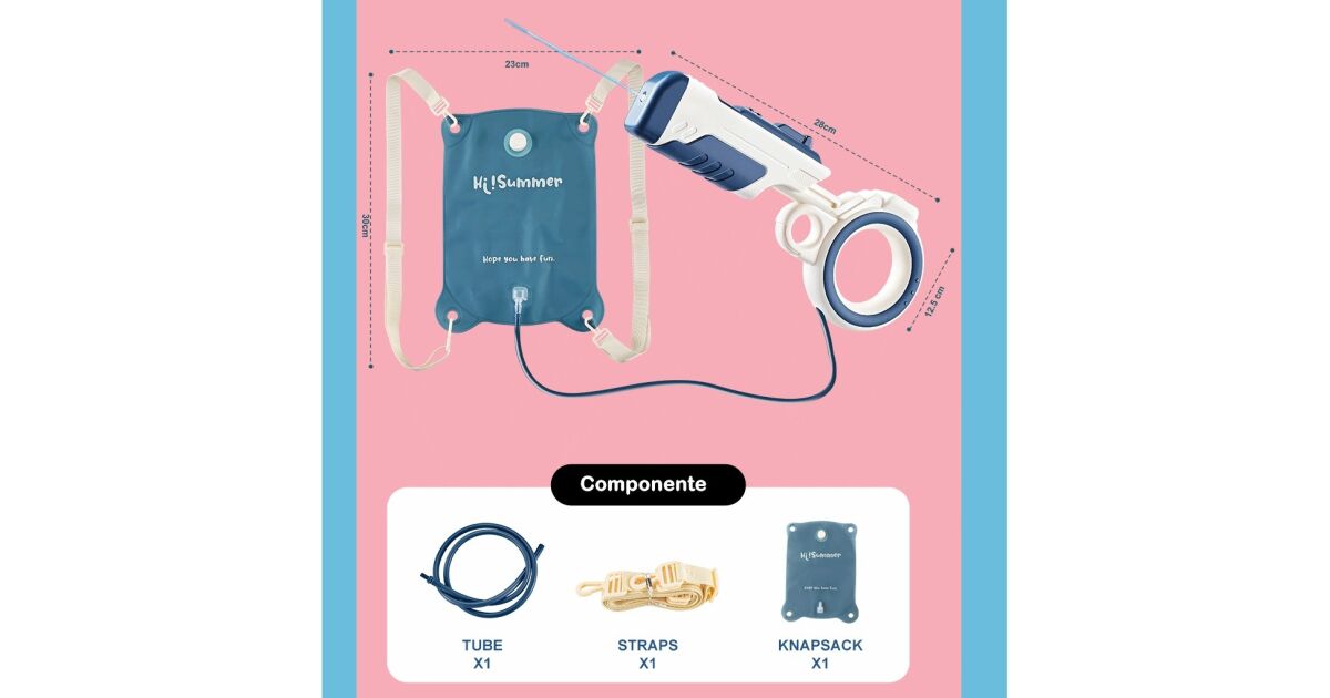 Pistol cu apa pentru copii KipHome, rezervor tip ghiozdan, 1500 ml, reglabil, material ABS/silicon, distanta improscare 8 metri, tragaci cu presiune, 12.5 x 28 cm, albastru Descriere