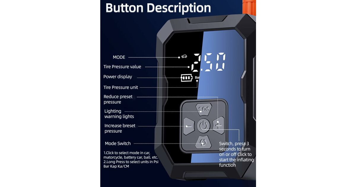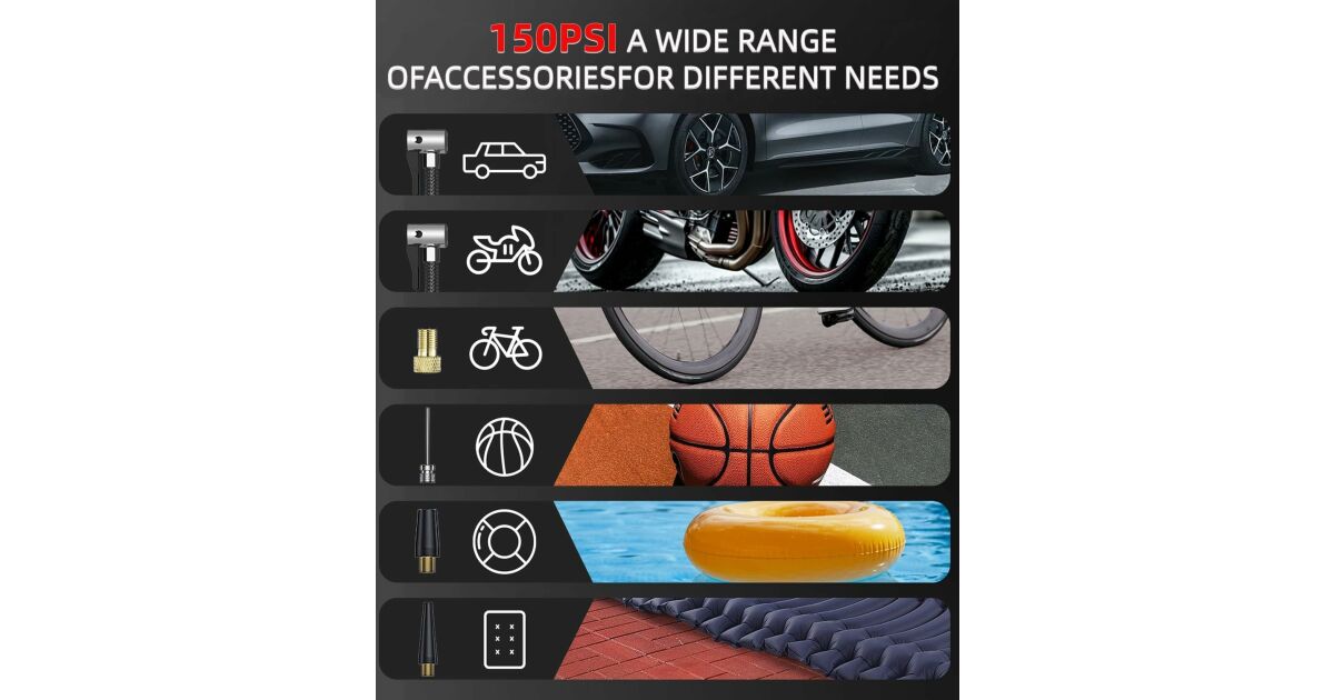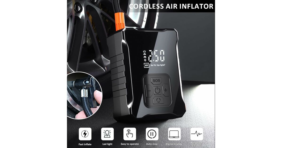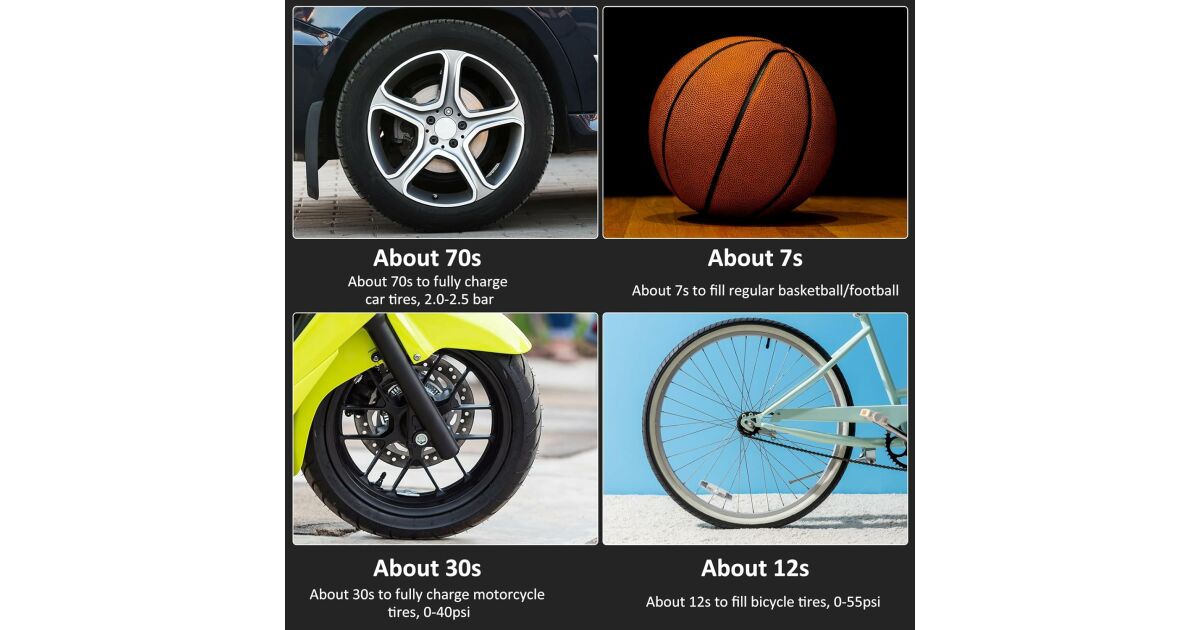 - Umflare rapidă: Umflă o anvelopă de dimensiunea 195/55/R15 de la 29 PSI la 36 PSI în doar 1 minut.