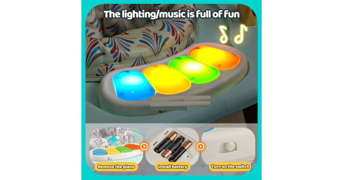 - Jocuri educative: Peste 12 jocuri educative, pian acționat cu piciorul, sunete și texturi care stimulează simțurile și abilitățile motorii ale bebelușului. 🎹