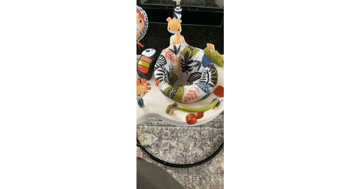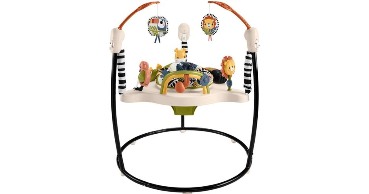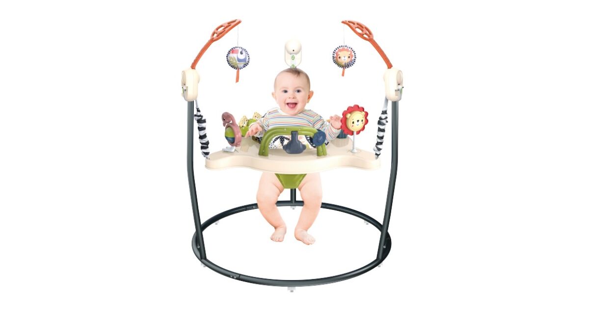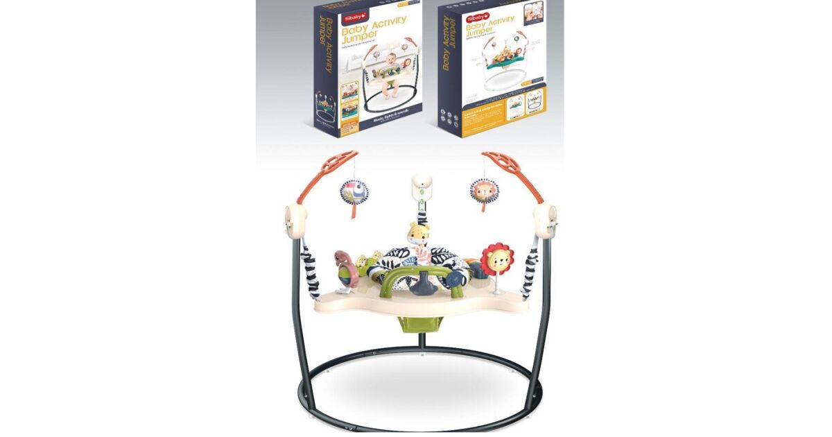 - Jucării colorate, lumini și sunete: Stimulează simțurile bebelușului și fac săriturile distractive.