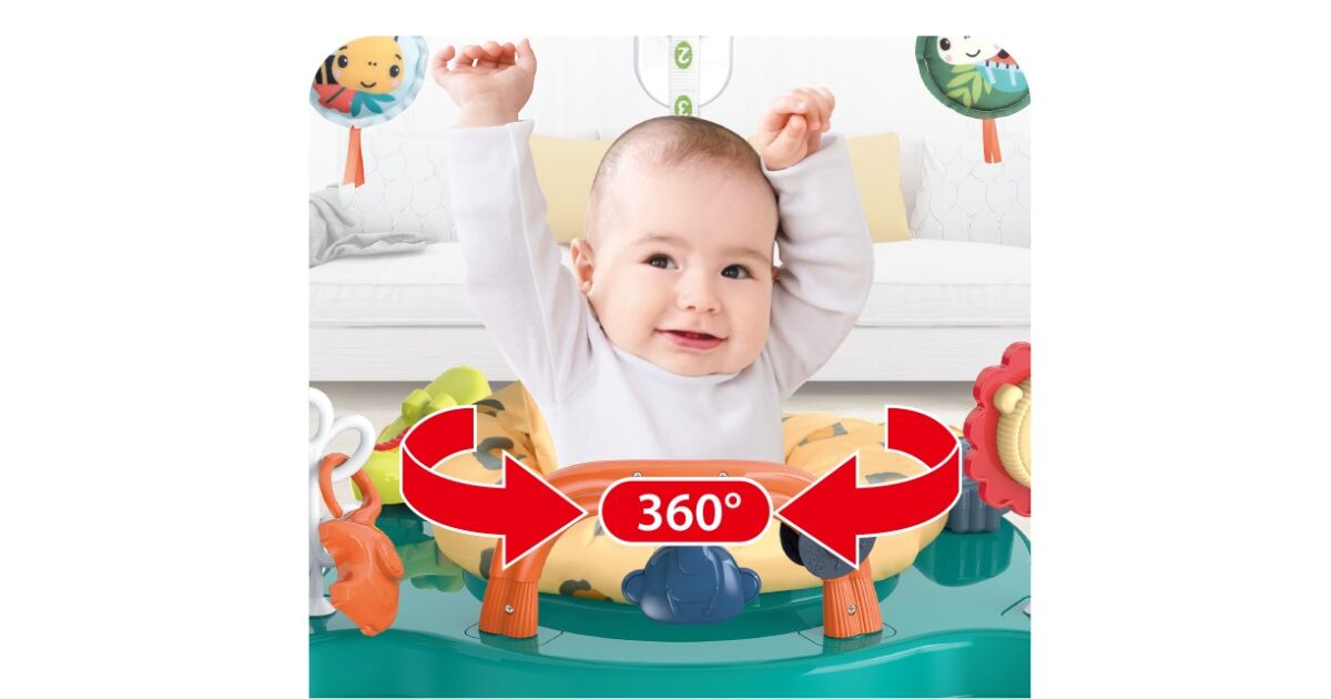 Acest centru de joacă cu sărituri este perfect pentru bebelușii de peste 6 luni care își pot ține capul singuri. Ajută la dezvoltarea motrică a bebelușului, îi întărește mușchii picioarelor și îi dezvoltă simțul echilibrului. Datorită scaunului rotativ la 360 de grade, cel mic poate explora mediul înconjurător în toate direcțiile.