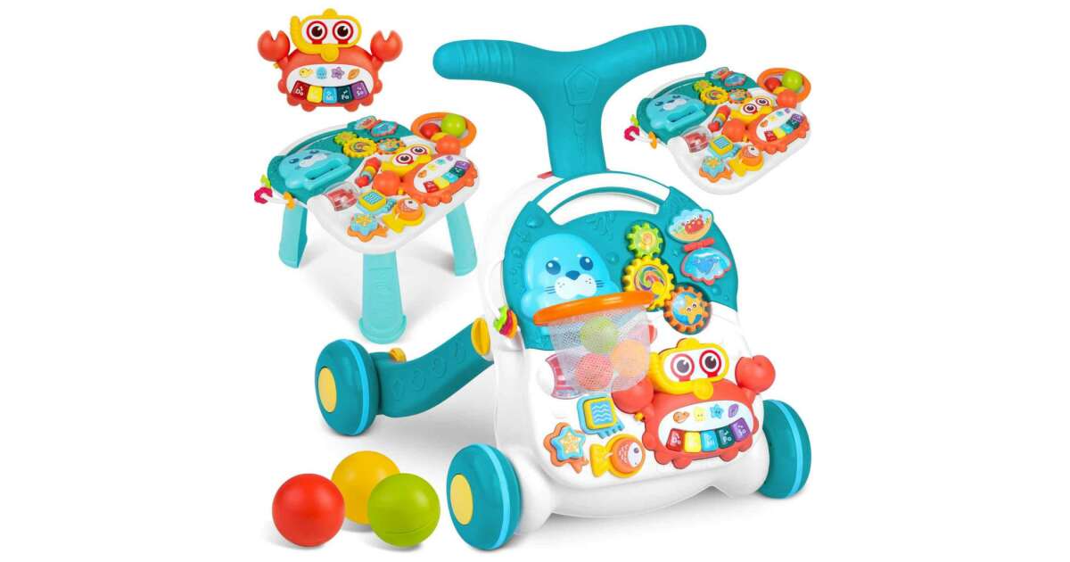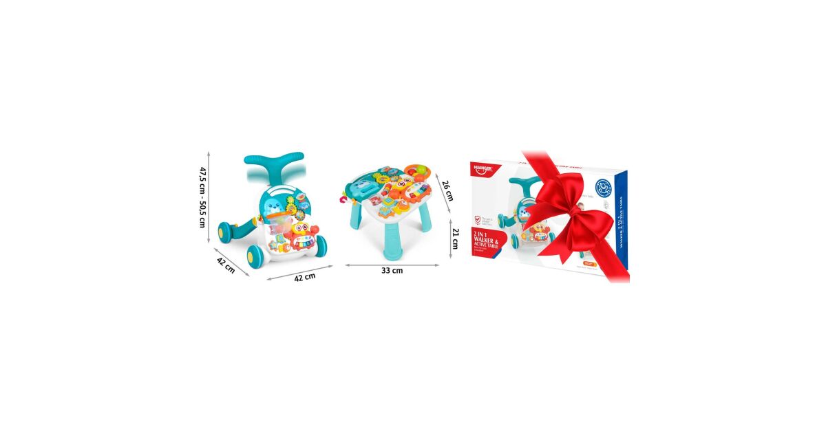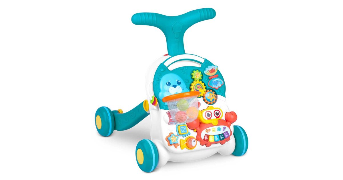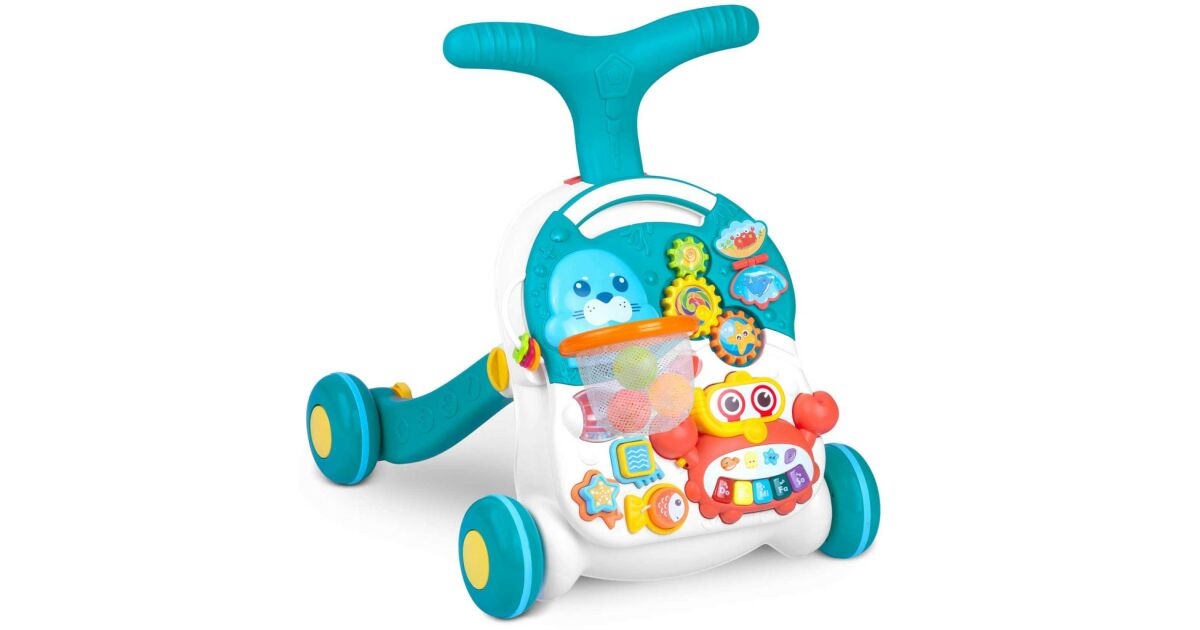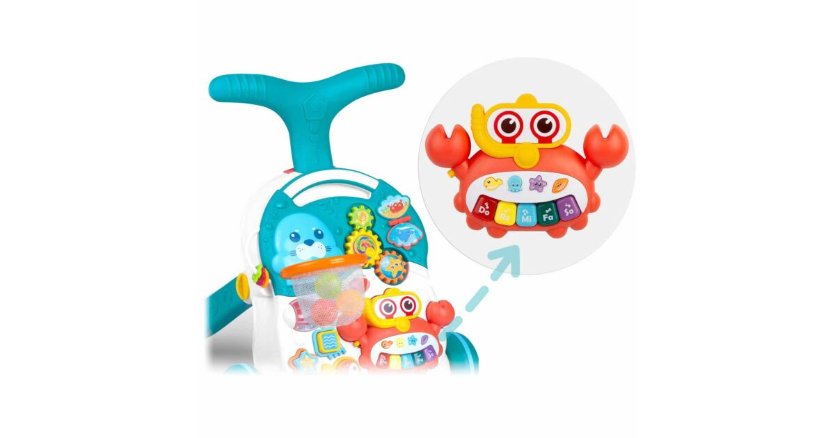 Acest ajutor de mers versatil e mai mult decât un simplu cărucior! Ajută bebelușul să învețe să meargă, în timp ce se distrează cu jucării care îi dezvoltă motricitatea fină, abilitățile cognitive și creativitatea. E confortabil, stabil și sigur, plus că poate fi folosit și ca măsuță!
