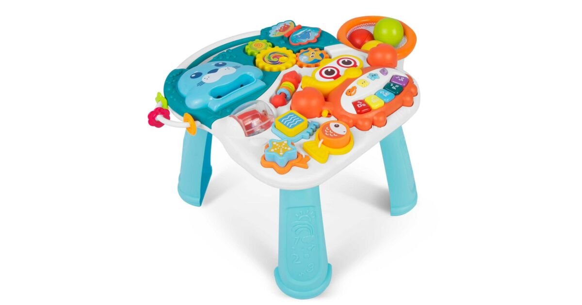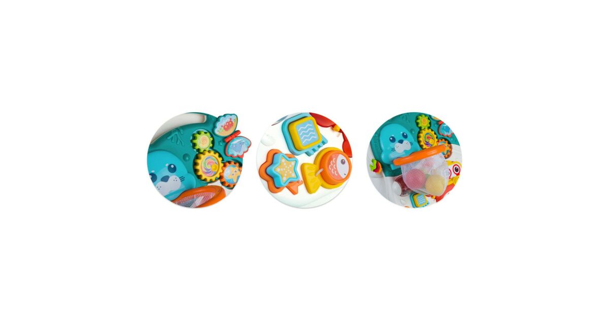 - 🧩 Măsuță educativă: Panou educațional detașabil, colorat, cu numere, forme, culori, roți dințate mobile, pian și coș cu bile (3 bile incluse).