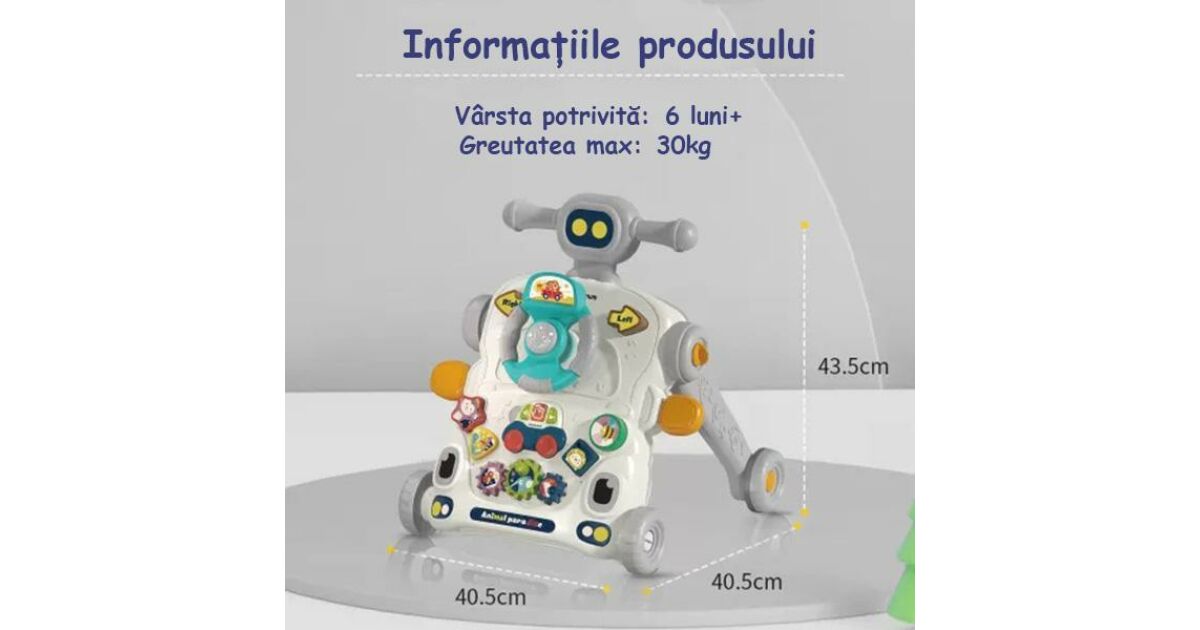 Antemergator cu centru de activitati multifunctional 3 in 1 WePro Store, mod anti-rasturnare, tastatura muzicala, lumini si sunete, roti antiderapante, 6 luni +, Gri Descriere