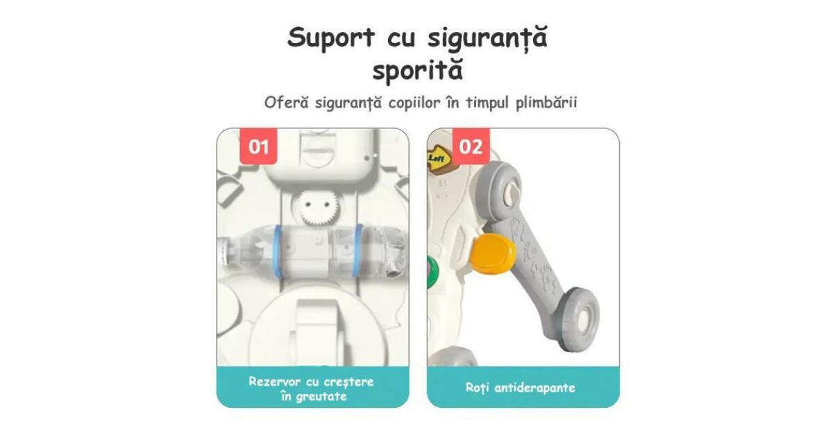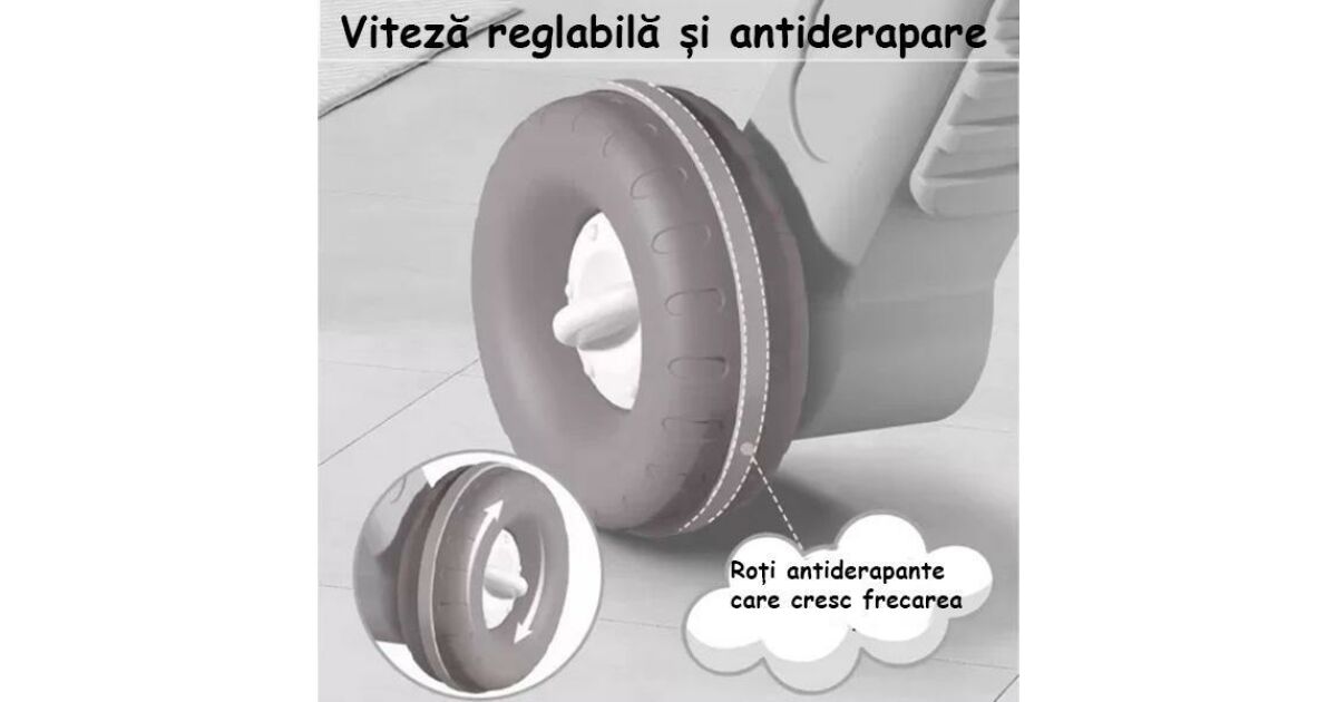 - Roți antiderapante: Asigură o mișcare sigură pe toate suprafețele.
