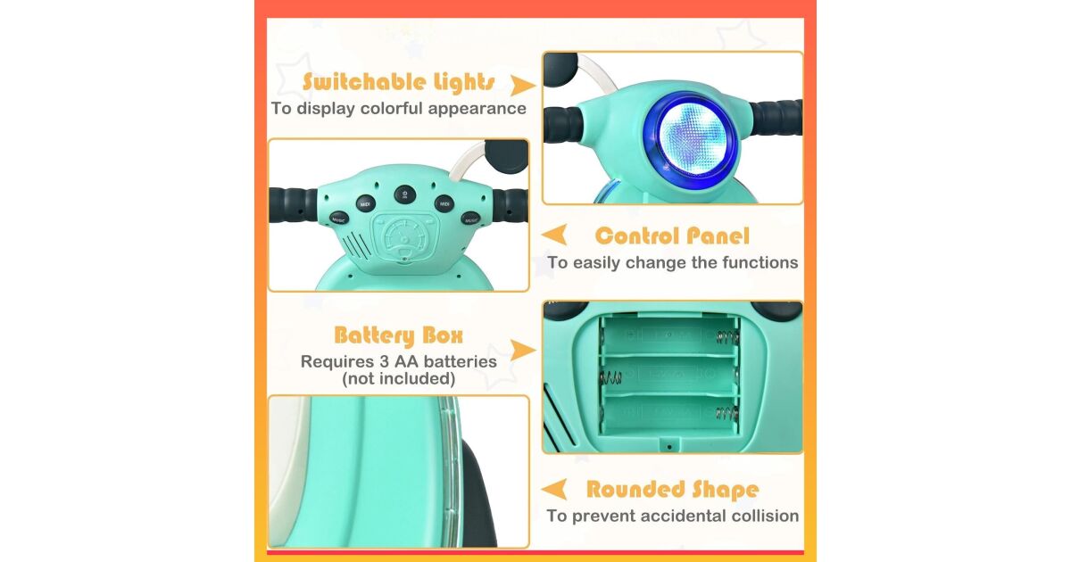 - 🚗 Ușor de controlat: Bebelușul poate controla cu ușurință vehiculul, îmbunătățindu-și astfel coordonarea mișcărilor.